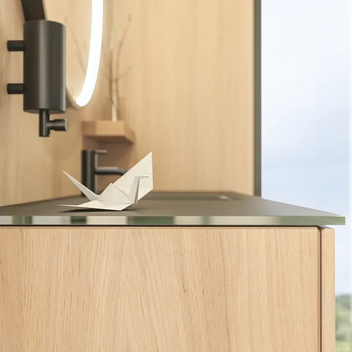 We love natural wood – from light types of wood to darker tones. Nordic decoration is light and open, with lightweight, functional furniture and beautiful, simple details. Adding natural wood to your design creates images of untamed Scandinavian scenery, and brings liveliness to the bathroom. We have wooden decors in several of our ranges, but Calidris in particular stands out in this area. All Calidris wooden elements are over-veneered on solid oak edges, and this provides uniform quality with a more beautiful, natural grain and texture. Read more about oak veneer in Calidris.