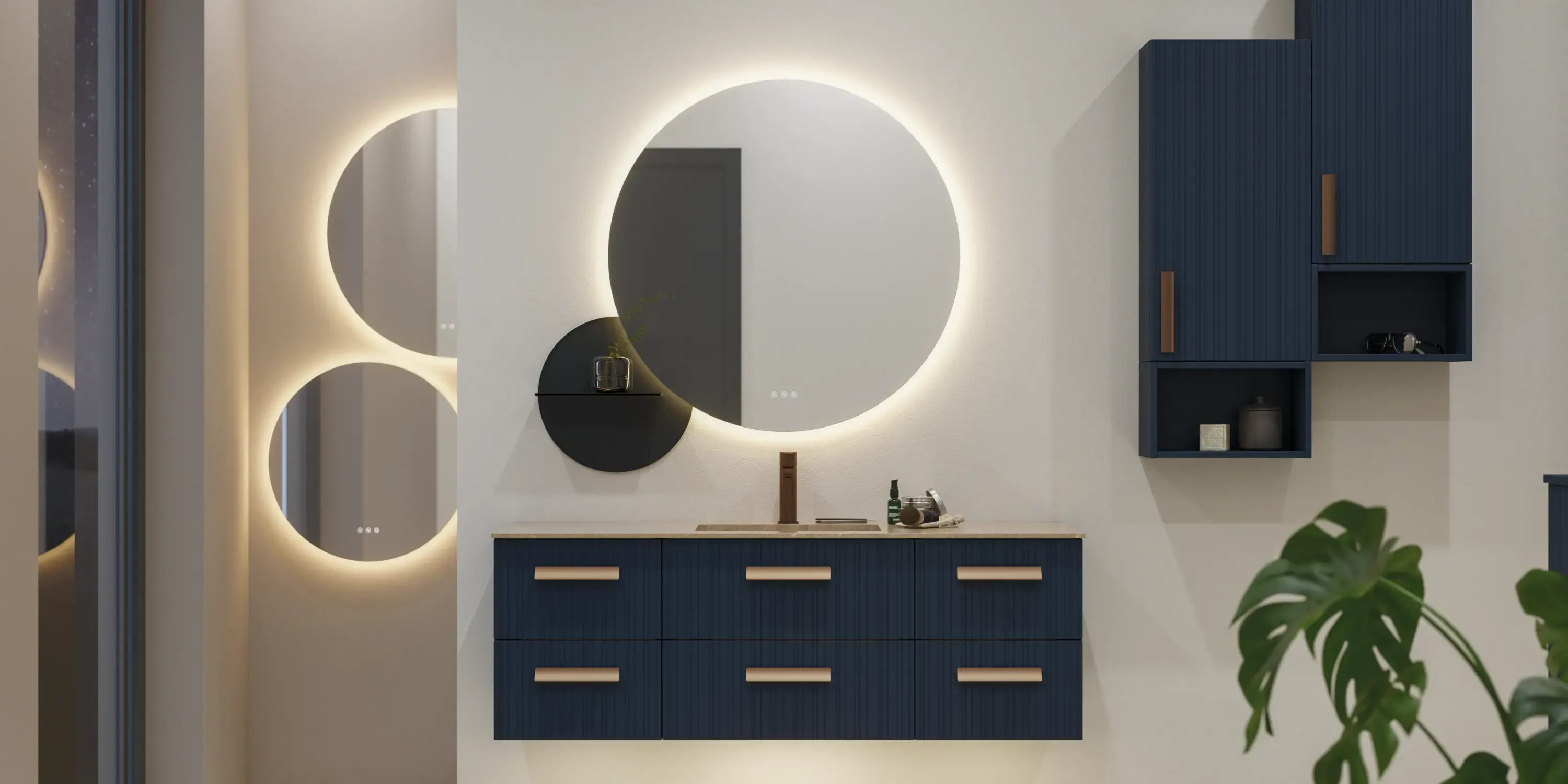 Large bathroom inspiration with light blue bathroom furniture with light wood sides, elegant mirror cabinets, minimalist black legs and handles, double bathroom set, and large white marble tiles create a classic, modern, and symmetrical look