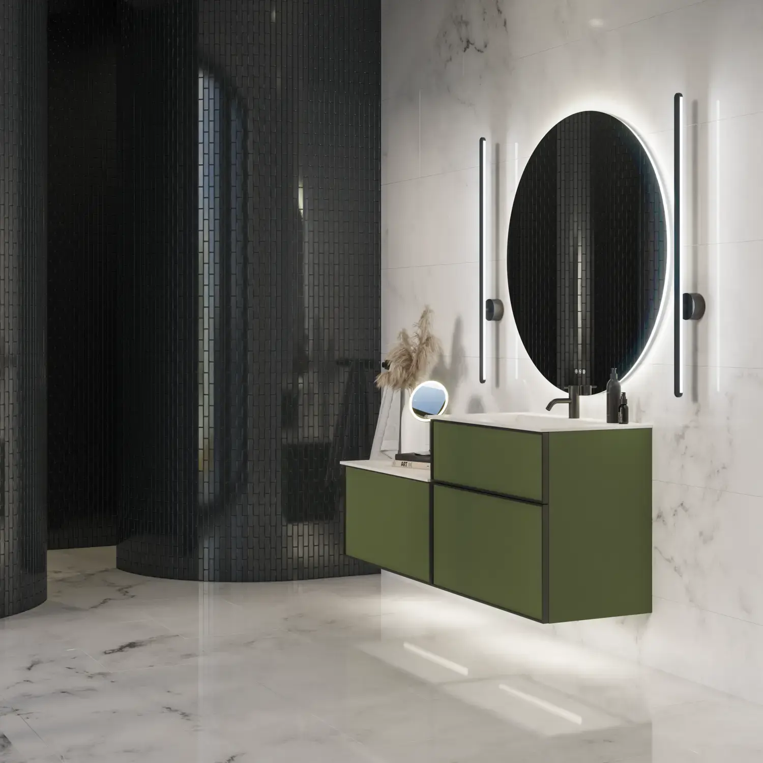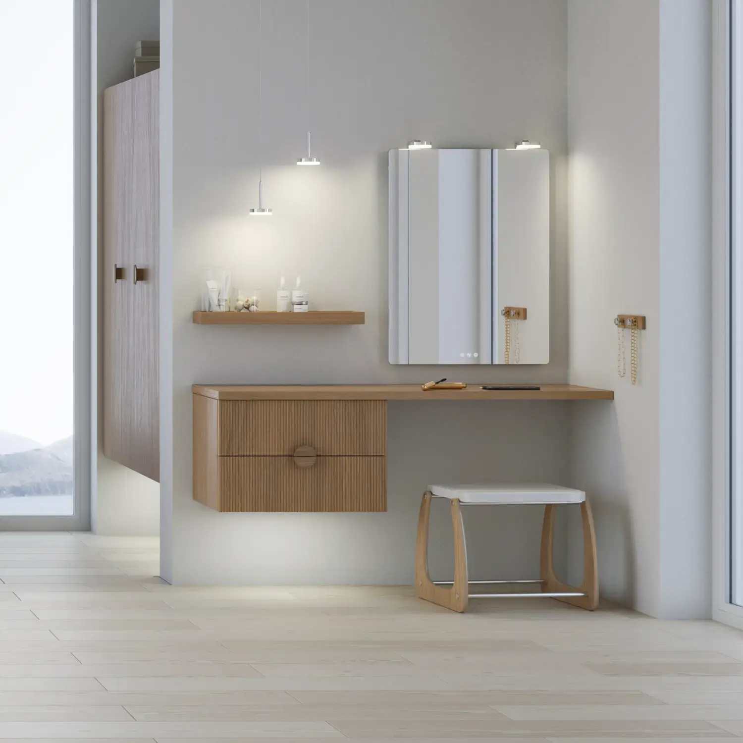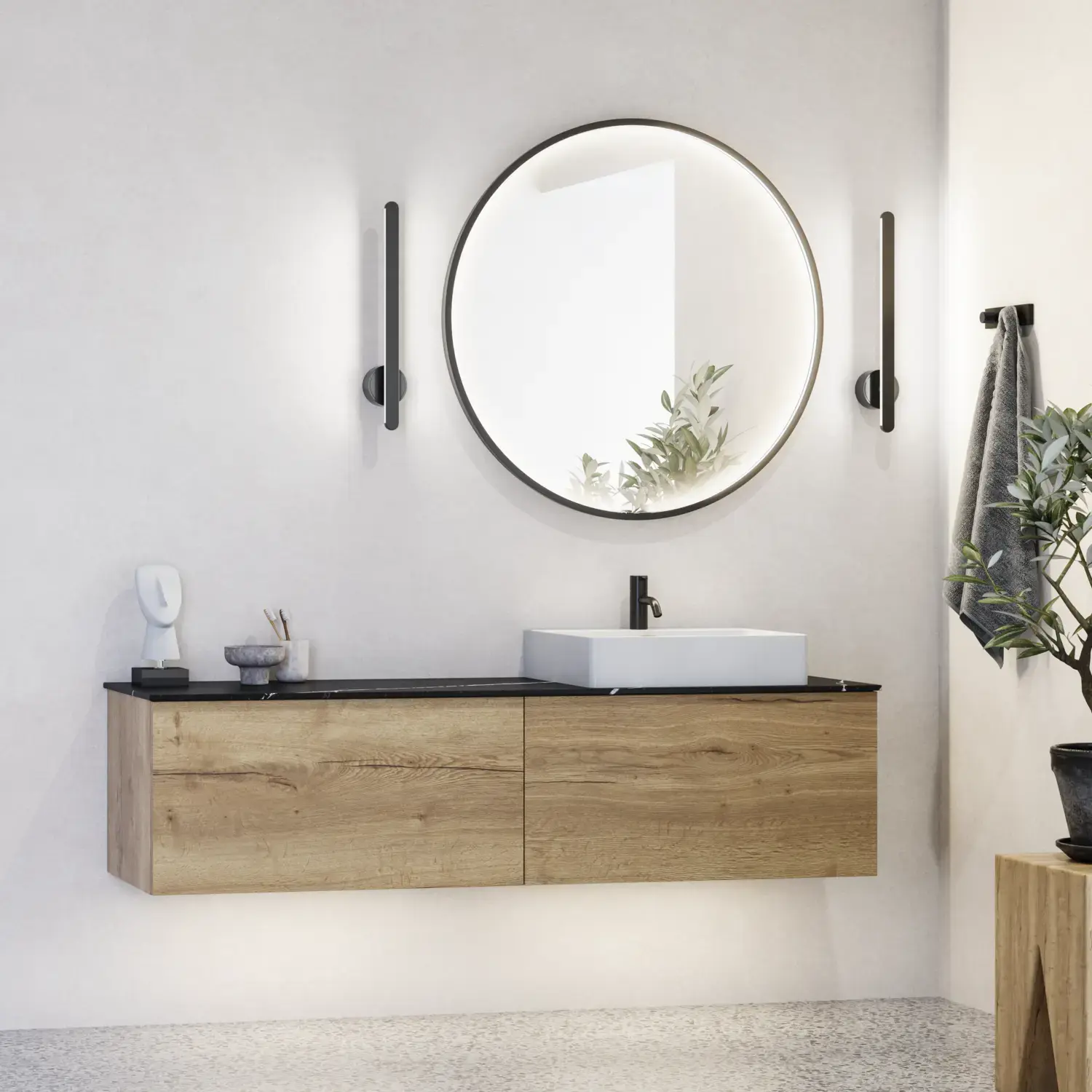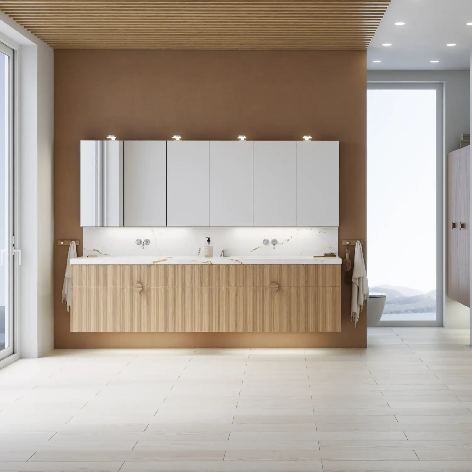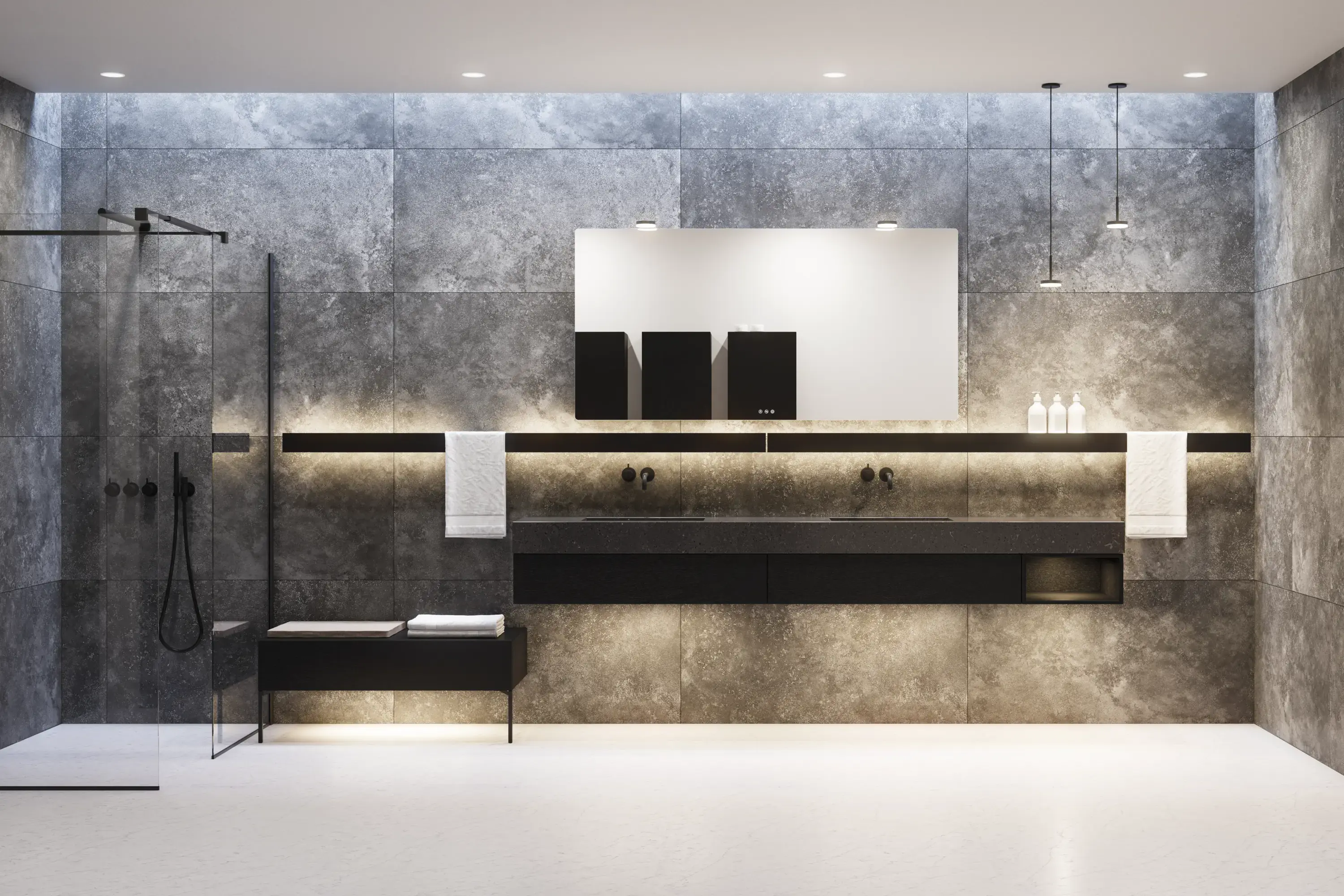 While 2026 embraces soft, organic shapes a clear countertrend is emerging: clean lines and a more architectural look - especially in lighting. Elongated lamps beside the mirror create a sleek, professional look while providing comfortable, functional lighting for everyday use. Control over brightness and colour temperature is becoming increasingly important, as lighting has a major impact on mood and well-being.