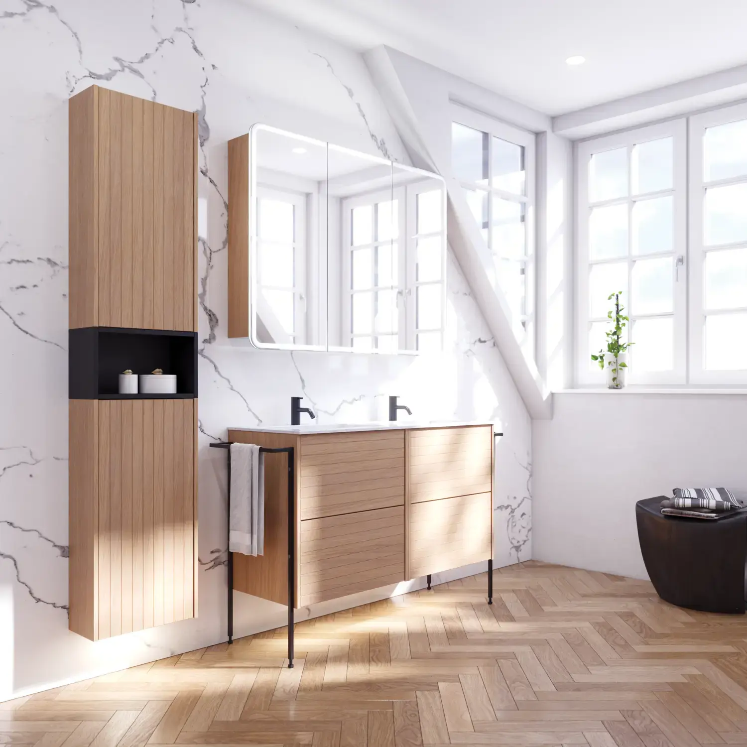 The knob handles can also be combined with small open modules or shelves, allowing you to decorate freely – for example with towels, baskets or personal items. In the Calidris series, the knobs are also available in veneer, further emphasising the natural and exclusive look.