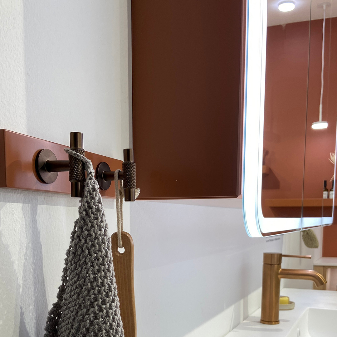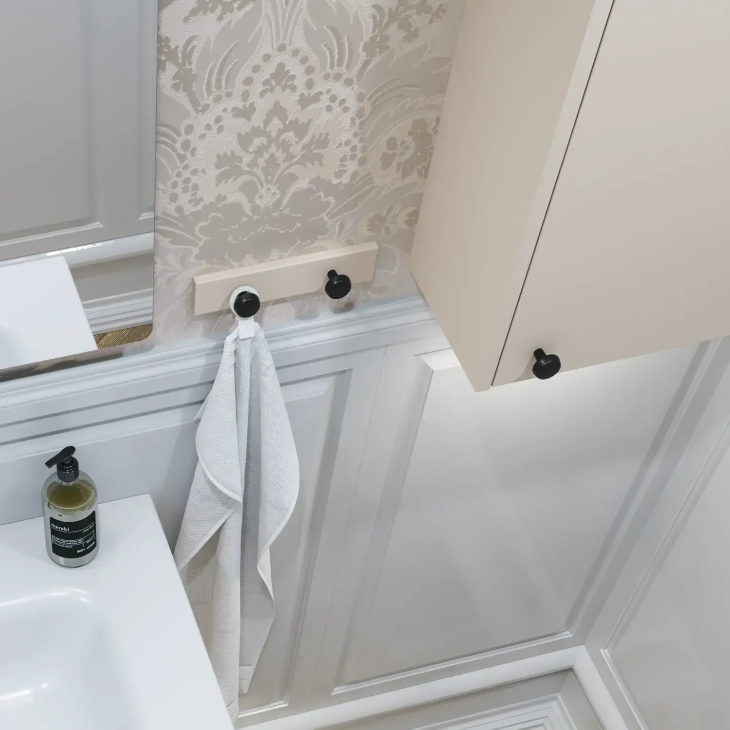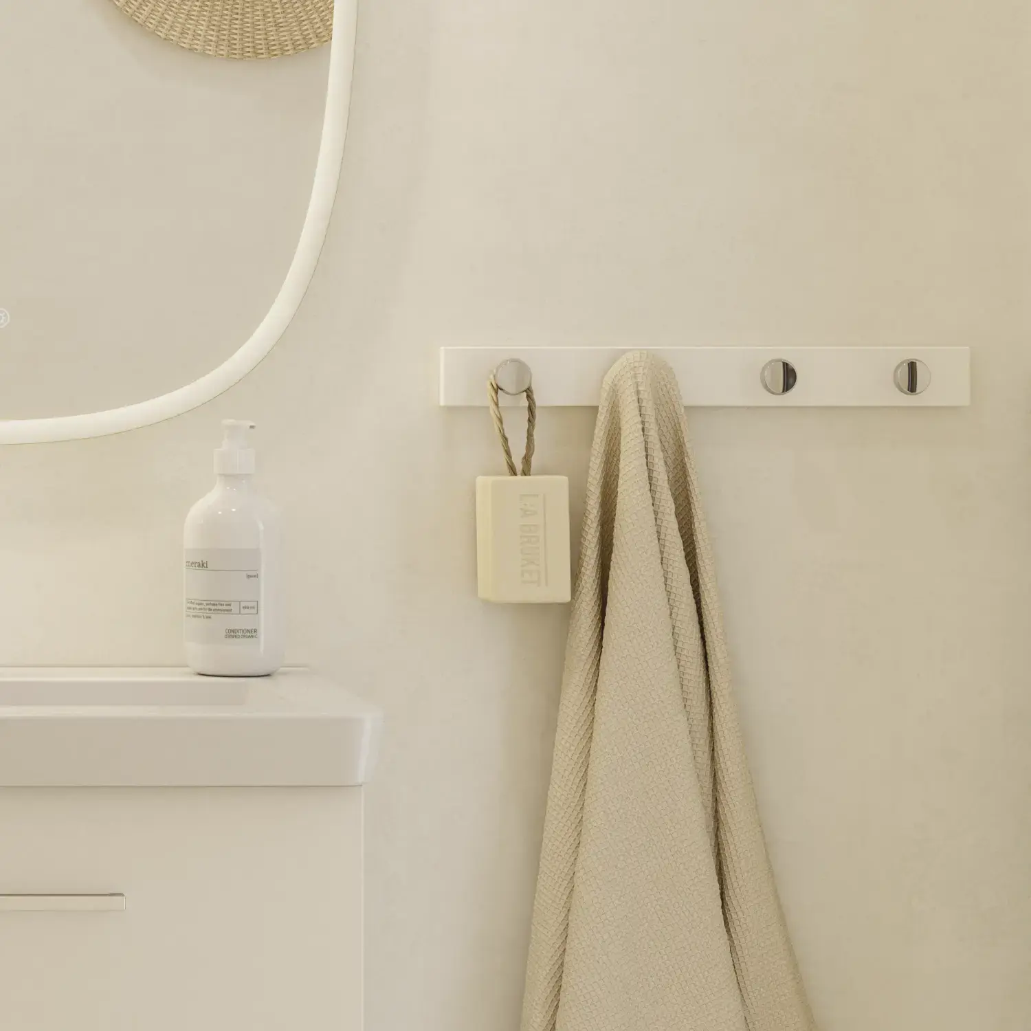 Our coat rack with optional knob style handles offers a smart way to work with this trend. The same handles can double as hooks, creating visual harmony across furniture and walls, thereby contributing to a calm, balanced and highly considered bathroom interior.