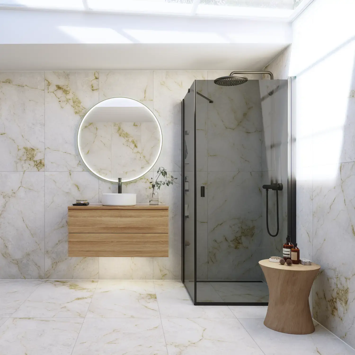 Dimmable lighting allows the bathroom to transition effortlessly from functional morning light to calm, relaxing evening lighting.