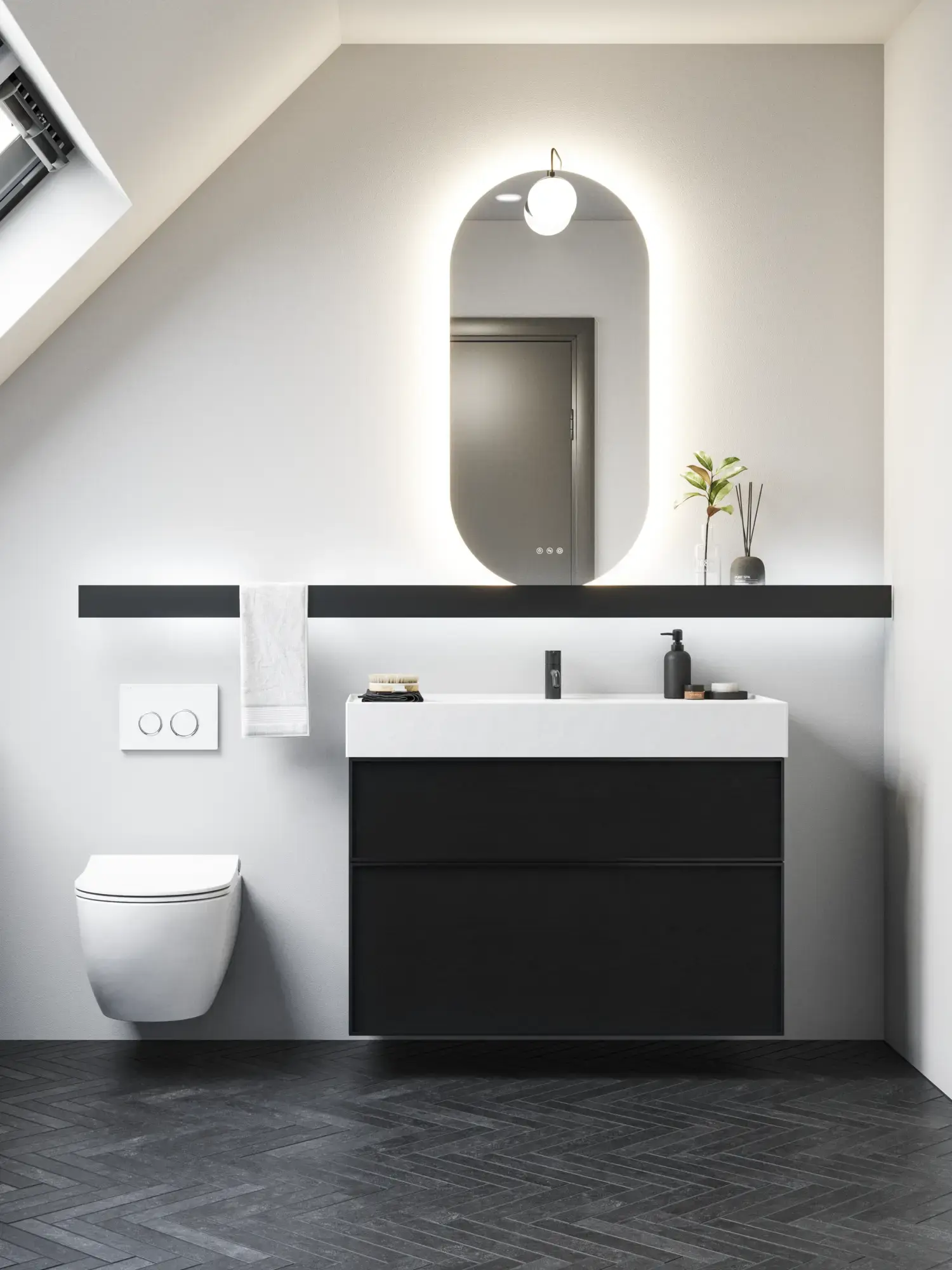 Don’t think of your new bathroom in the attic as a problem room which is harder to furnish functionally than more usual bathroom layouts. Many of our furniture ranges provide the opportunity to use every last bit of space using asymmetric solutions and worktops in bespoke measurements.