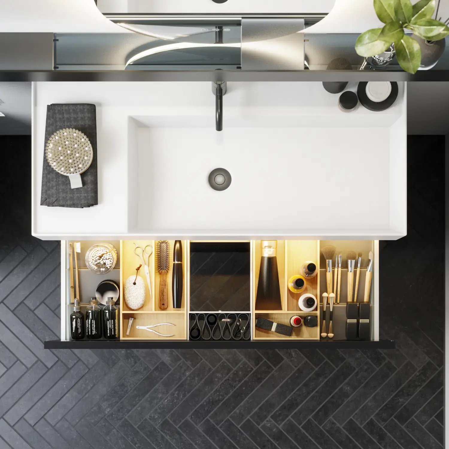 If the toilet gets in the way of the drawer pull-out, you can combine drawers in an elegant, lightweight design with open storage space for, for example, towels or laundry.