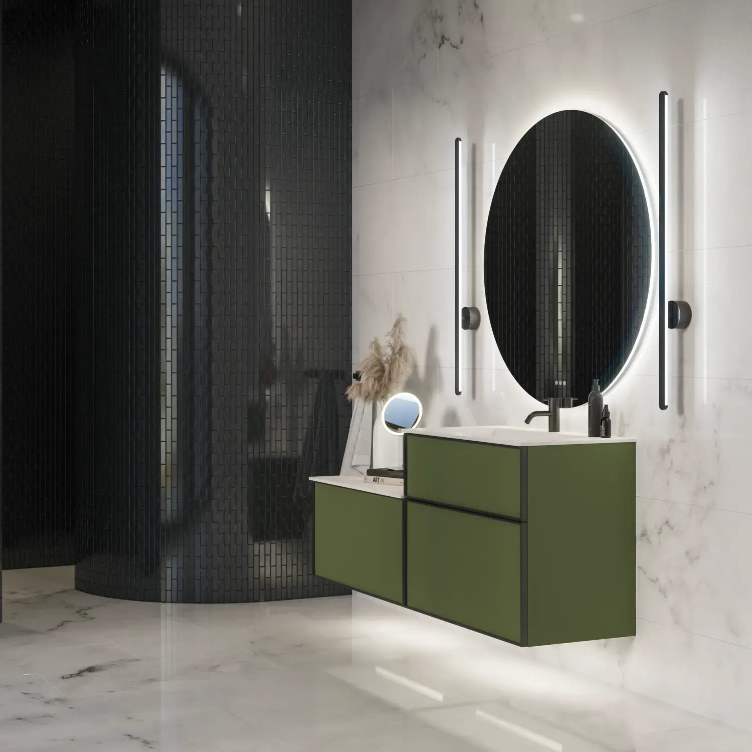You can also decorate your room in the same shades when you carry out your bathroom renovation. This gives a well-thought-out look with an exclusive and calm feel when keeping the walls and the bathroom furniture in a tone-in-tone palette. The luxurious effect of a tone-in-tone palette is sometimes used to make small areas seem bigger.