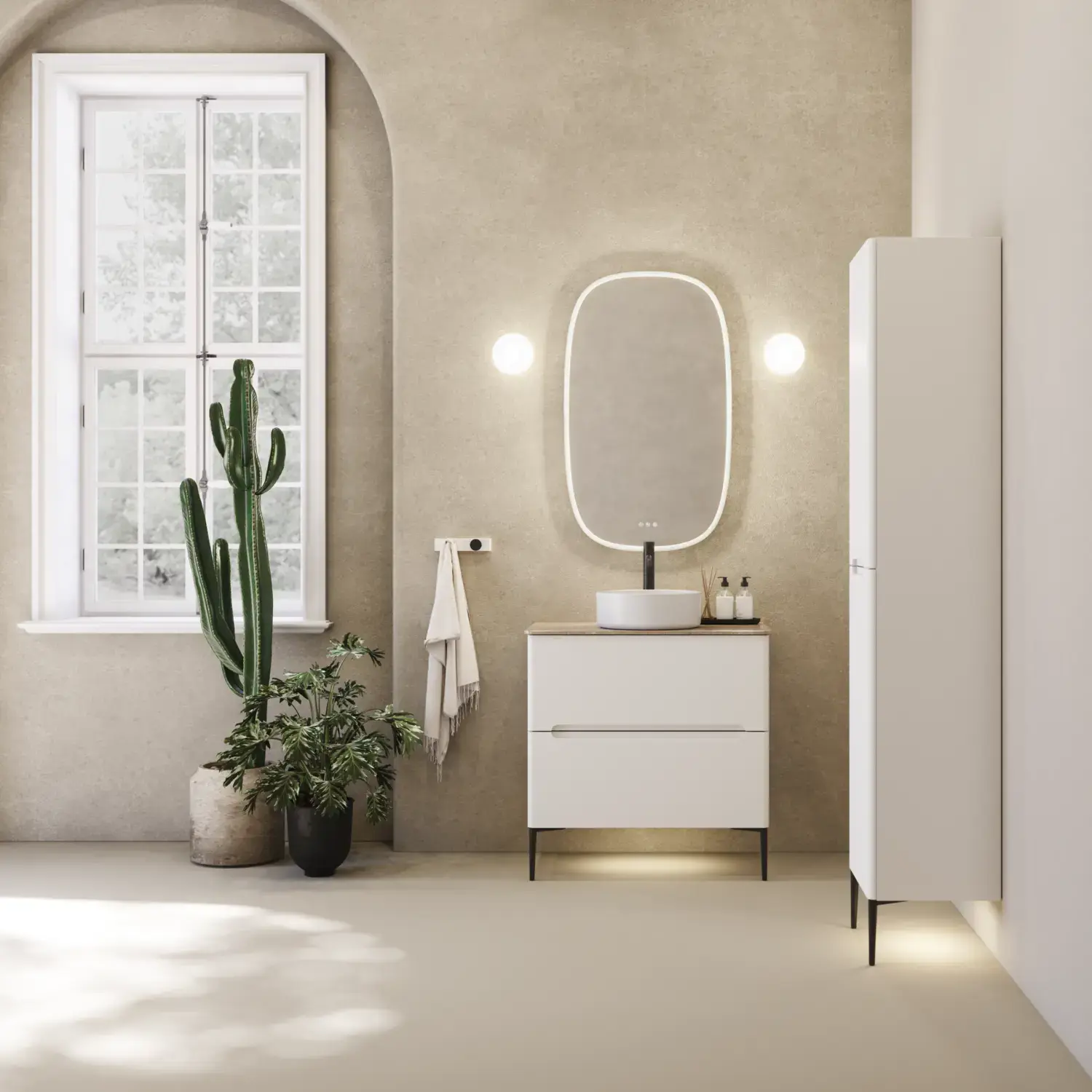 If your bathroom is narrow you can choose a short projection basin solution to maximise floor space without compromising on worktop space. If you need a longer continuous worktop an offset basin setting is a great solution. Choose a mirror cabinet instead of a mirror using the wall space to provide extra storage as well as your mirror.