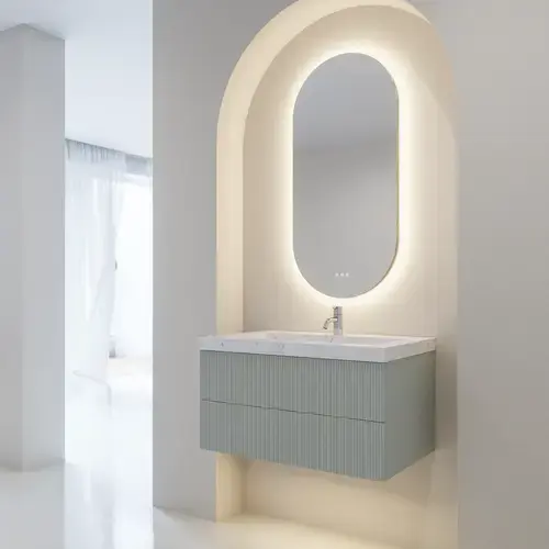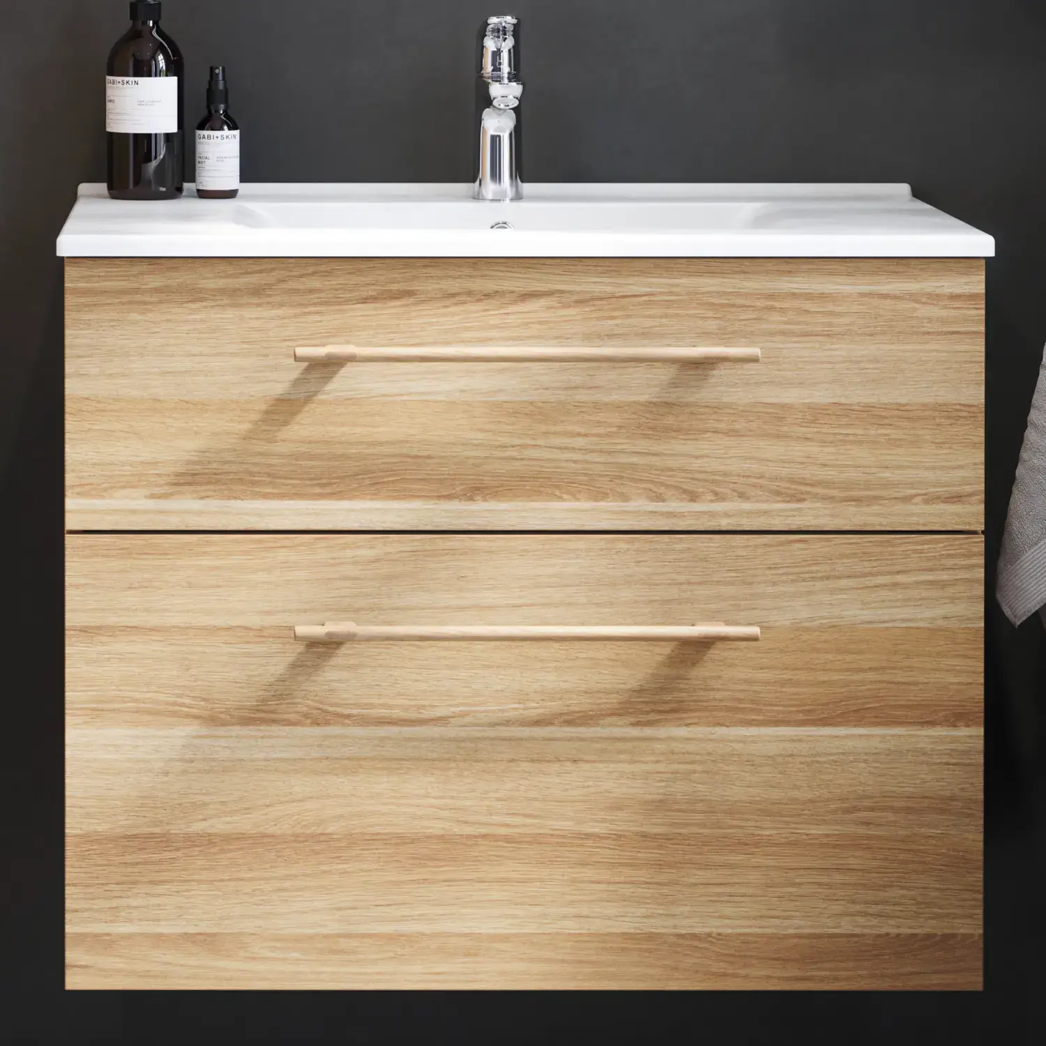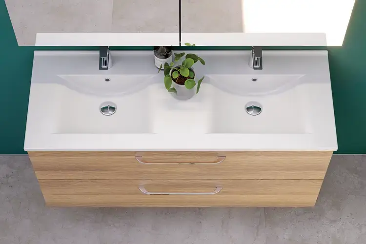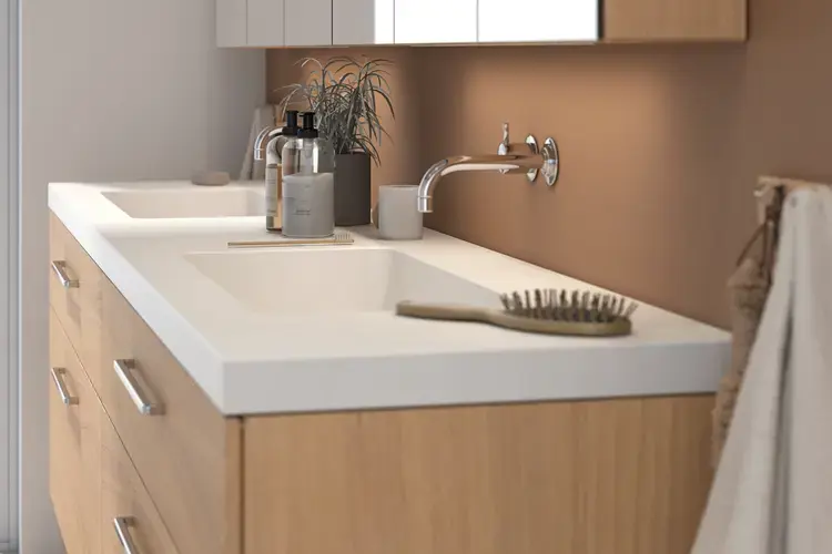 Whether a drawer or door front has a handle or not defines the style and appearance of your bathroom suite. Therefore it is an important decision which solution to choose for your furniture. You have the absolute freedom to give your bathroom personality. Create beautiful contrasts with a wide range of handles in beautiful forms and colours or choose the simple handle free solution with push-open-function where you open doors and drawers with a light push. You can also choose furniture with an elegant integrated handle which follows the width of the front and turns upwards so that water and dirt can’t accumulate.