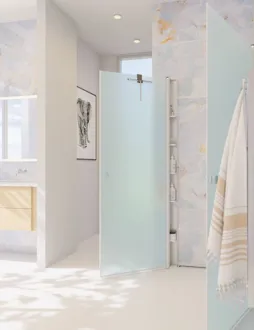 The hinged doors bring both elegance and functionality to your bathroom. The doors are extremely practical and user-friendly, as they can be opened both inwards and outwards. This allows you to free up space in your bathroom when the shower is not in use. The swing doors open and close easily and silently on durable hinges, ensuring easy access to the shower. At the same time, they provide an effective screen to keep water inside the shower area and keep the rest of the bathroom dry and clean. The tempered glass in the doors is treated with EasyCare, extending the durability and lifespan of your swing doors.