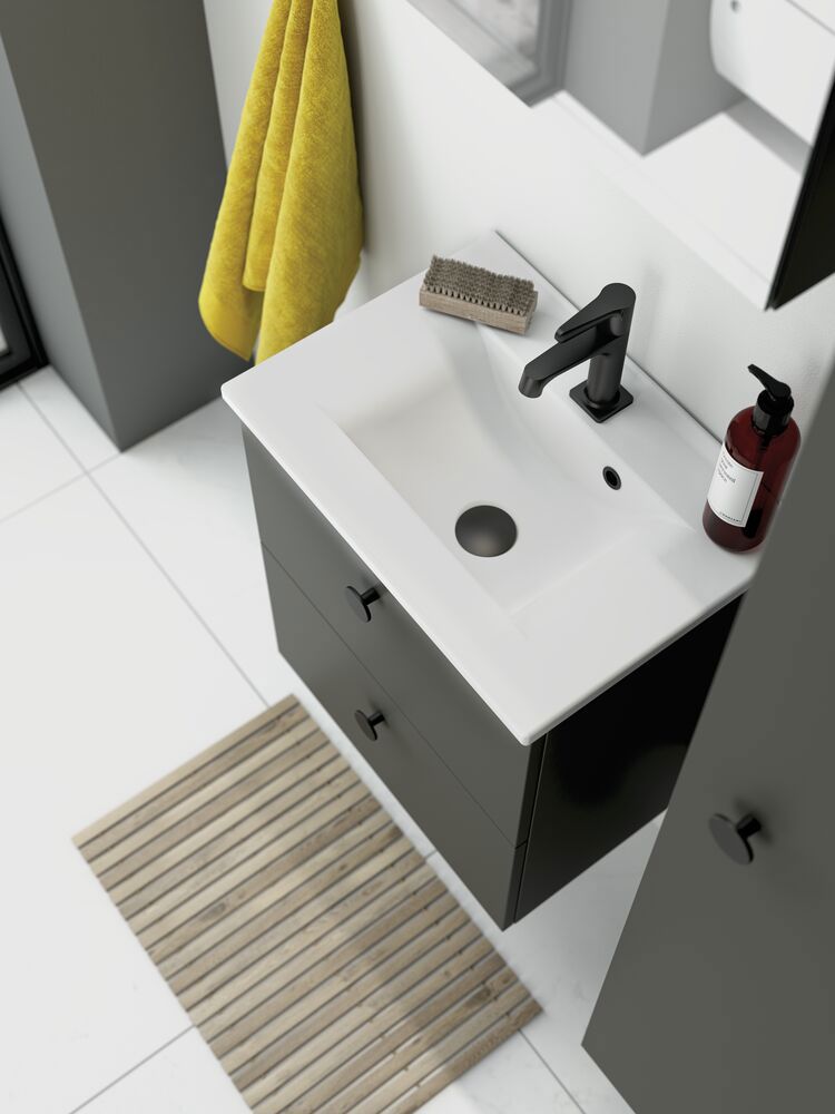 The Amber Mini basin with its elegant, thin profile and short projection still offers a large basin area. It fits perfectly into smaller bathrooms as it has a projection of only 35cm. The basin is made of sanitary porcelain, which is a strong and durable material that is incredibly easy to maintain and clean.