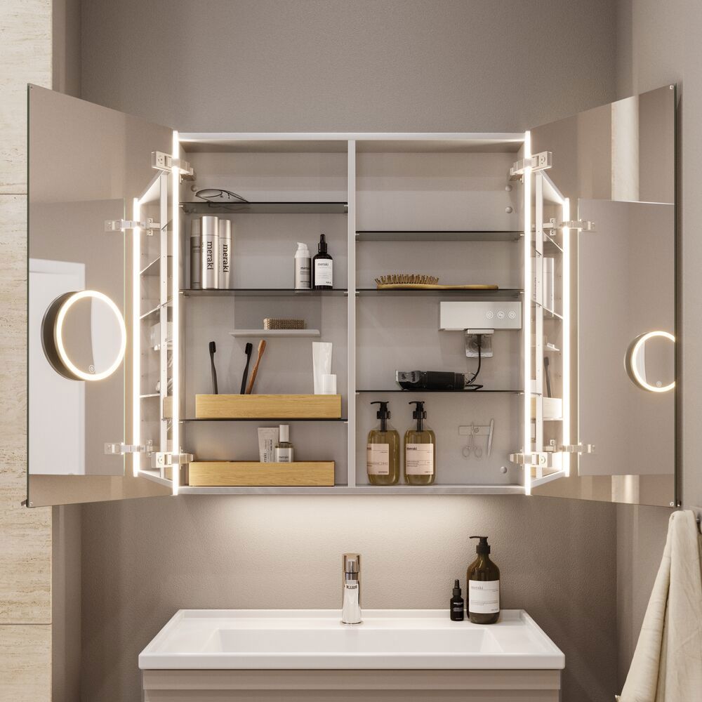 Experience both beautiful design and functionality with the Ambi mirror cabinet. The mirror cabinet offers plenty of extra storage space and comes with a magnifying mirror, metal shelf and magnetic accessory holder. Inside you'll also find a handy electrical socket and a USB port that you can use for your shaver or when you need to charge your electric toothbrush. The Ambi mirror cabinet is of course available in beautiful colours, so you get a mirror cabinet that matches your bathroom furniture. NB: There is a start-up fee (BI2) for products with bespoke colour. It is an one-off surcharge per bespoke colour regardless number of products.