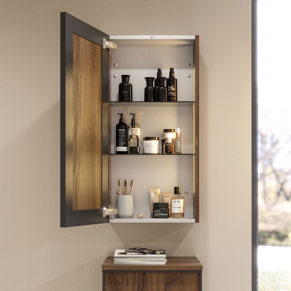 The base cabinet with a black frame in Version B offers a functional and stylish solution for your bathroom. With a width of 40 cm and a depth of 35 cm, this base cabinet is equipped with a pull-out tray and a laundry bag, making it ideal for storing both cosmetics and laundry. The black frame adds a modern edge to your bathroom, while the practical design ensures that everything remains organized and easily accessible. With this base cabinet, you can optimize your storage space and create a tidy environment where you can easily find everything you need. NB: There is a start-up fee (BI2) for products with bespoke colour. It is an one-off surcharge per bespoke colour regardless number of products. Remember to add the little practical things to your bathroom furniture that you will enjoy on a daily basis. For example, lights in drawers and cabinets, built-in electrical sockets and dimmed sensor lights under the furniture to guide night-time bathroom visits. Options are ordered at the same time as your furniture.