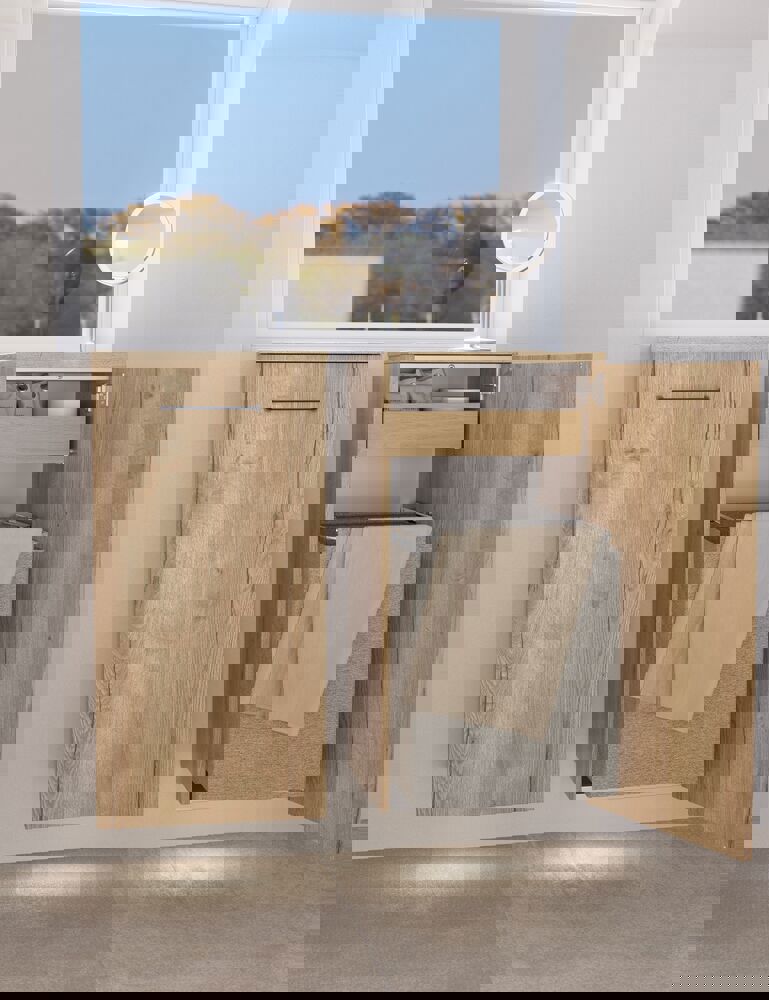 Discover the functionality that the base cabinet with a smooth front in Version B offers. With a width of 40 cm and a depth of 35 cm, this base cabinet is designed with a practical pull-out tray and a laundry bag, creating extra storage space for both cosmetics and laundry. The smart solutions ensure that you can easily keep your bathroom organized and have everything at hand when you need it. The smooth front adds a sleek design that will elevate your bathroom decor while providing optimal storage space. NB: There is a start-up fee (BI2) for products with bespoke colour. It is an one-off surcharge per bespoke colour regardless number of products. Remember to add the little practical things to your bathroom furniture that you will enjoy on a daily basis. For example, lights in drawers and cabinets, built-in electrical sockets and dimmed sensor lights under the furniture to guide night-time bathroom visits. Options are ordered at the same time as your furniture.
