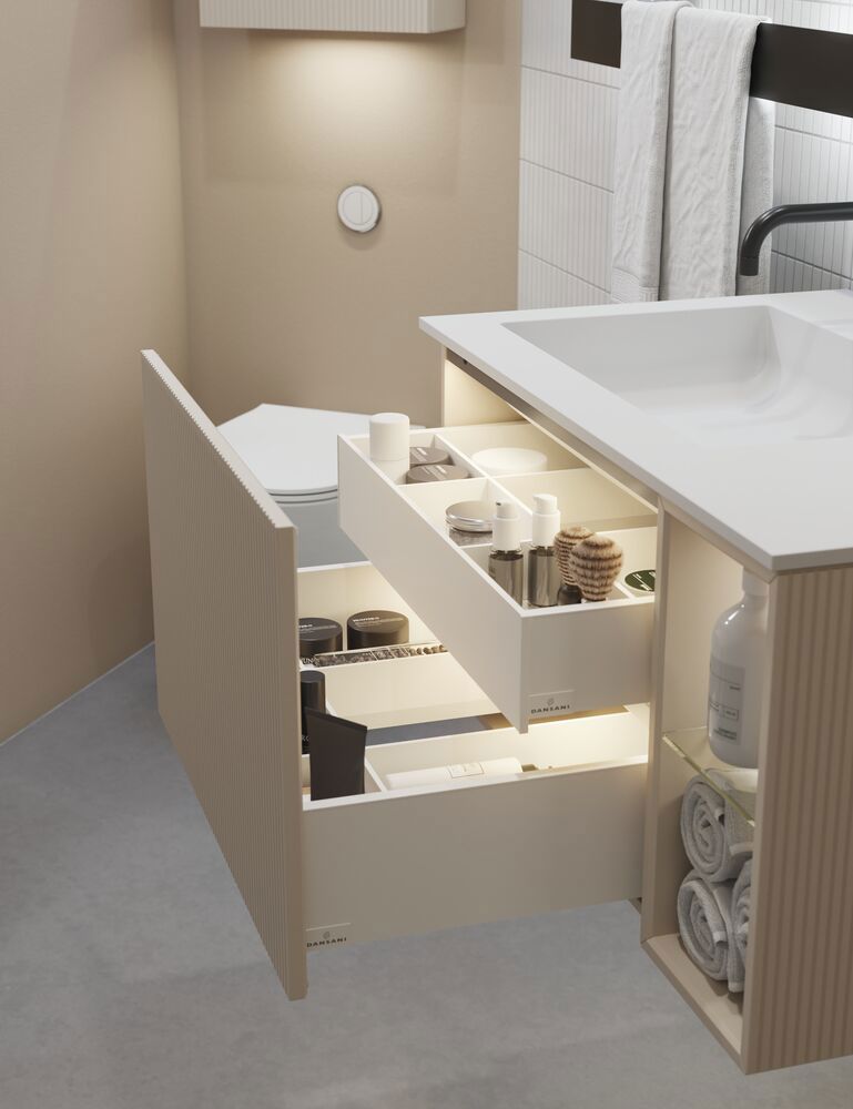 With Calidris you get luxury in a class of its own, and the narrow grooved front with grooved side is no exception. Here you get both front and side in the same exclusive grooved design, giving your bathroom furniture a complete and perfect look. The vertical grooves, finished in beautiful veneer or a gorgeous lacquered color, create a sense of quality and refined craftsmanship. The result is a piece of furniture that exudes high-end design and brings a warm, sophisticated atmosphere into the room. Calidris is created for those who want the ultimate in Danish bathroom design - where both function and aesthetics come together. NB: This front works as an option for your furniture, so first select the size and item number of your bathroom furniture and then add the optional front to your order.