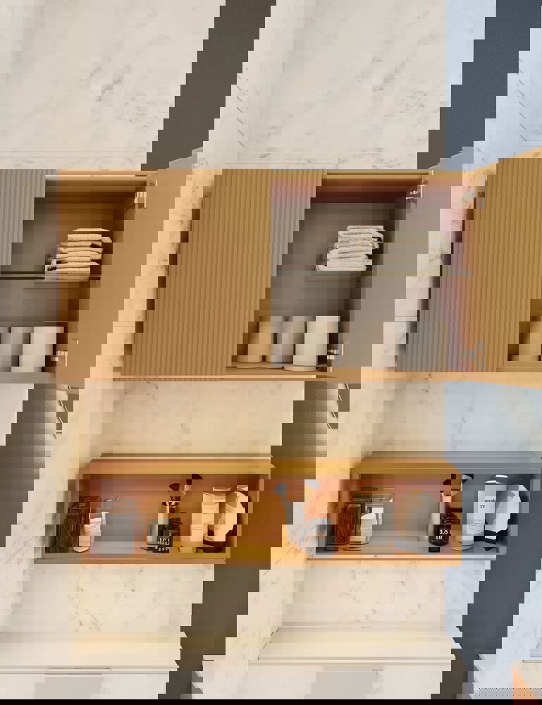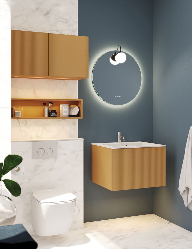 Internal lighting (IP21) and LED downlight to floor incl. motion sensor (IP44) and wireless lighting control (IP44) NOTE: Requires a constant electrical feed to the vanity downlight as well as a mirror solution with wireless lighting control and an external switch. You can combine mirrors, spotlights and pendant lights in a group, so they can be adjusted together at a single touch. Adjusting the mirror lighting will also adjust the colour and brightness of the spotlights and pendant lights.