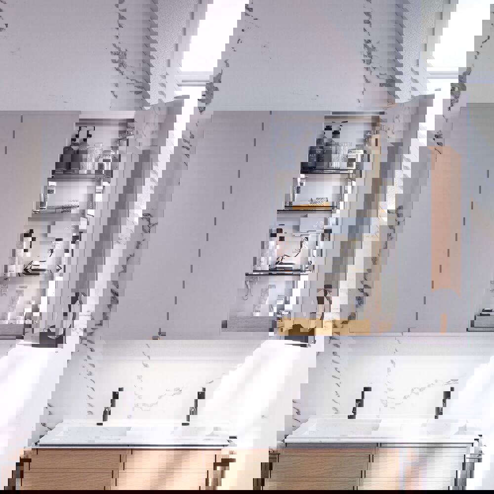 Get practical storage and stylish design with the Style mirror cabinet. The mirror cabinet is perfect for storing all your creams, deodorant, nail clippers, toothbrushes and more. Add lights to the mirror cabinet and control the colour and strength of the light with a single touch. The beautiful mirror cabinet includes a magnetic accessory holder, metal shelf, magnifying mirror and electrical socket, making your morning and evening routines much easier. NB: There is a start-up fee (BI2) for products with bespoke colour. It is an one-off surcharge per bespoke colour regardless number of products.