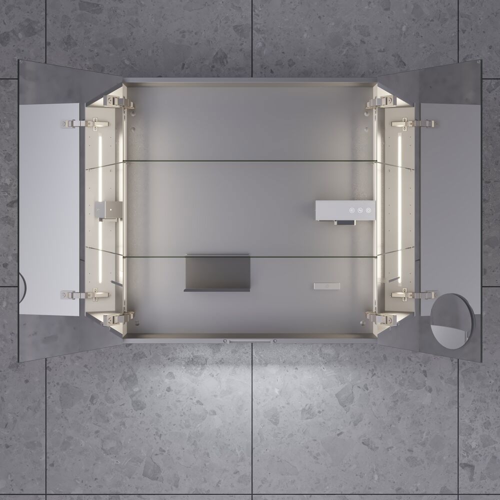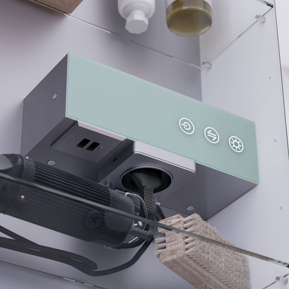Get practical storage and stylish design with the Style mirror cabinet. The mirror cabinet is perfect for storing all your creams, deodorant, nail clippers, toothbrushes and more. Add lights to the mirror cabinet and control the colour and strength of the light with a single touch. The beautiful mirror cabinet includes a magnetic accessory holder, metal shelf, magnifying mirror and electrical socket, making your morning and evening routines much easier. NB: There is a start-up fee (BI2) for products with bespoke colour. It is an one-off surcharge per bespoke colour regardless number of products.