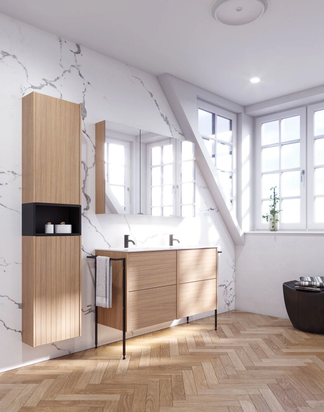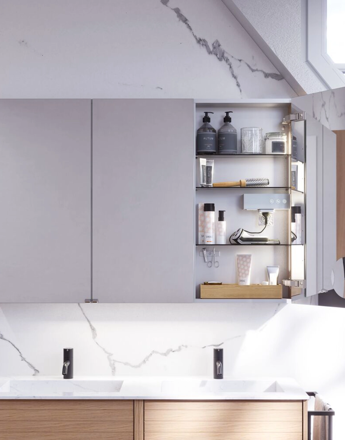 Get practical storage and stylish design with the Style mirror cabinet. The mirror cabinet is perfect for storing all your creams, deodorant, nail clippers, toothbrushes and more. Add lights to the mirror cabinet and control the colour and strength of the light with a single touch. The beautiful mirror cabinet includes a magnetic accessory holder, metal shelf, magnifying mirror and electrical socket, making your morning and evening routines much easier. NB: There is a start-up fee (BI2) for products with bespoke colour. It is an one-off surcharge per bespoke colour regardless number of products.