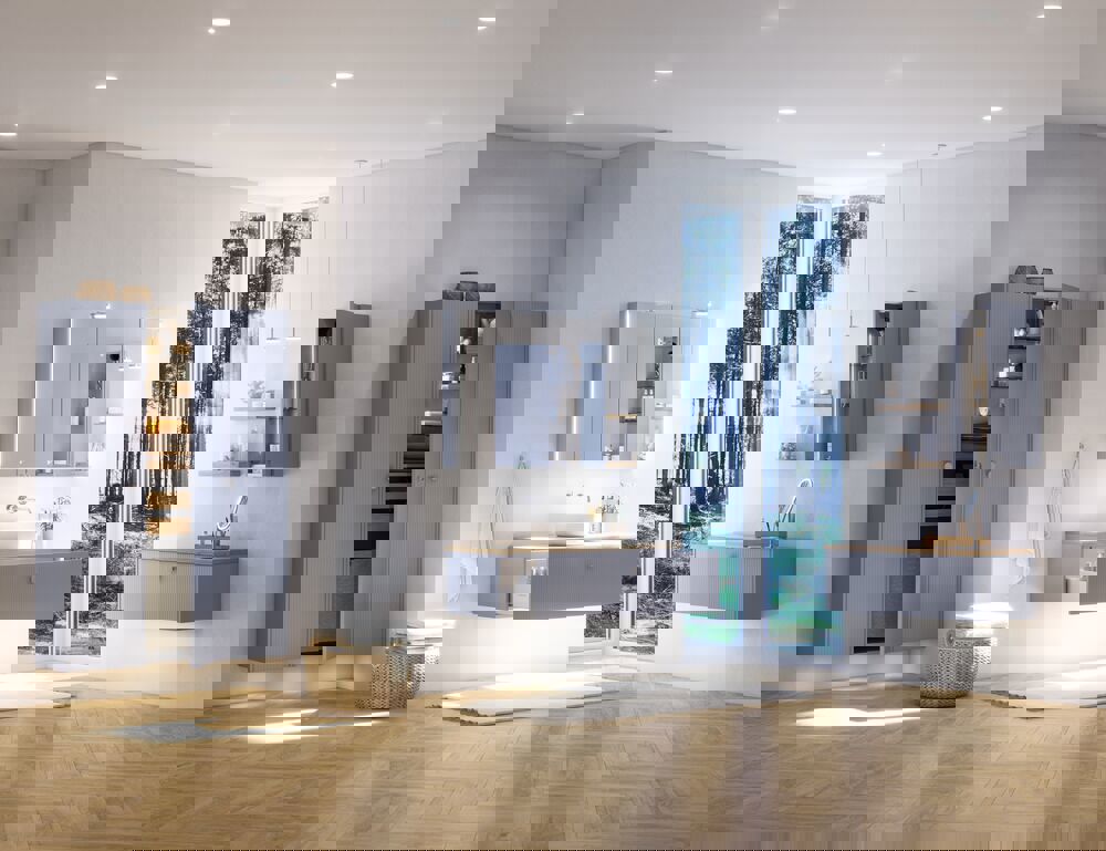 Upgrade your bathroom with a stylish tall cabinet in version A with striped front. The vertical stripes give the cabinet a modern and exclusive look that adds character and makes it a stylish addition to your interior. With a height of 176 cm and a depth of 35 cm, you get plenty of storage space for towels, toiletries and even extra bedding. The cabinet is fitted with one wooden shelf and five glass shelves so you can organize your things in a clear and elegant way where everything is easily accessible. The tall cabinet is available in white, sand and light blue - three colors that each create their own mood: choose white for a timeless and classic look, sand for a calm and natural look or light blue for a breath of fresh air in the bathroom. A functional and aesthetic piece of furniture that combines generous storage space with a personal design expression. Remember to add the little practical things to your bathroom furniture that you will enjoy on a daily basis. For example, lights in drawers and cabinets, built-in electrical sockets and dimmed sensor lights under the furniture to guide night-time bathroom visits. Options are ordered at the same time as your furniture.