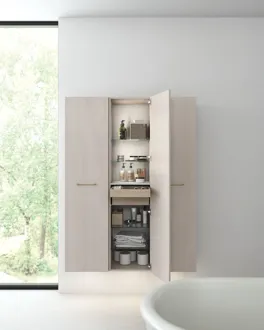 Bathroom storage becomes simple and stylish with Dansani Calidris tall units. These units are not only functional, but also look good and fit perfectly into modern bathrooms. With smart shelves and compartments, the Calidris tall units allow you to arrange everything from towels and toiletries to beauty products in an organised manner. The elegant design and clean lines of the tall units bring a sense of order and harmony to the bathroom. NB: There is a start-up fee (BI2) for products with oak and bespoke colour. It is an one-off surcharge per oak and bespoke colour regardless number of products. Remember to add the little practical things to your bathroom furniture that you will enjoy on a daily basis. For example, lights in drawers and cabinets, built-in electrical sockets and dimmed sensor lights under the furniture to guide night-time bathroom visits. Options are ordered at the same time as your furniture.