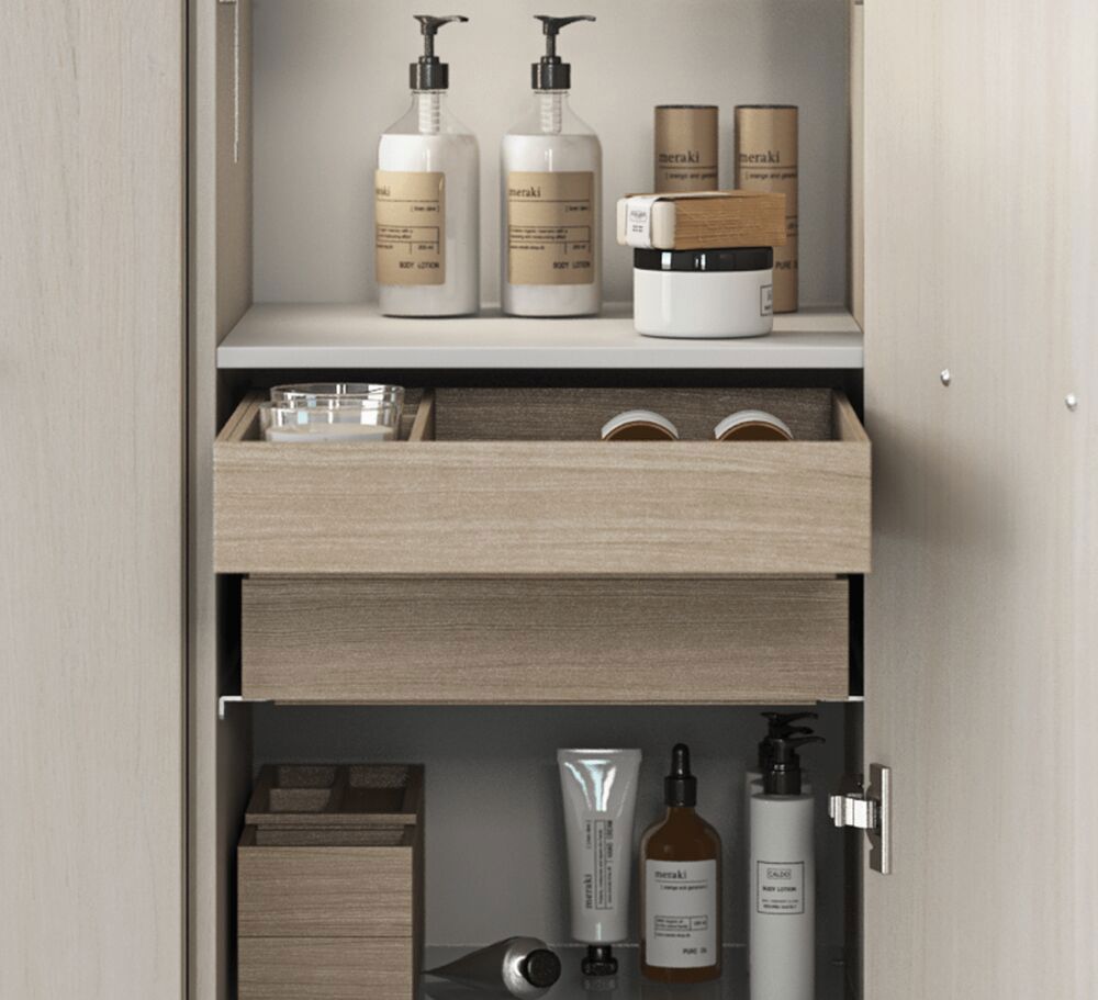 Bathroom storage becomes simple and stylish with Dansani Calidris tall units. These units are not only functional, but also look good and fit perfectly into modern bathrooms. With smart shelves and compartments, the Calidris tall units allow you to arrange everything from towels and toiletries to beauty products in an organised manner. The elegant design and clean lines of the tall units bring a sense of order and harmony to the bathroom. NB: There is a start-up fee (BI2) for products with oak and bespoke colour. It is an one-off surcharge per oak and bespoke colour regardless number of products. Remember to add the little practical things to your bathroom furniture that you will enjoy on a daily basis. For example, lights in drawers and cabinets, built-in electrical sockets and dimmed sensor lights under the furniture to guide night-time bathroom visits. Options are ordered at the same time as your furniture.