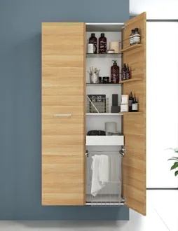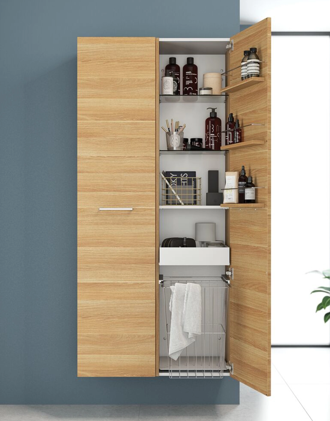 Make use of every bit of space in your bathroom with the Dansani Mido+ tall cabinet. With a tall cabinet you can fit all your essentials, so if you have the space, we really recommend a tall cabinet for your bathroom. In this tall cabinet you'll find 1 wooden shelf, 4 glass shelves and 3 shelves on the door itself, giving you plenty of space and the opportunity to perfectly organise your bathroom. Experience a new feeling of order and design in your bathroom with the Dansani Mido+ tall cabinet.