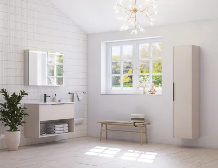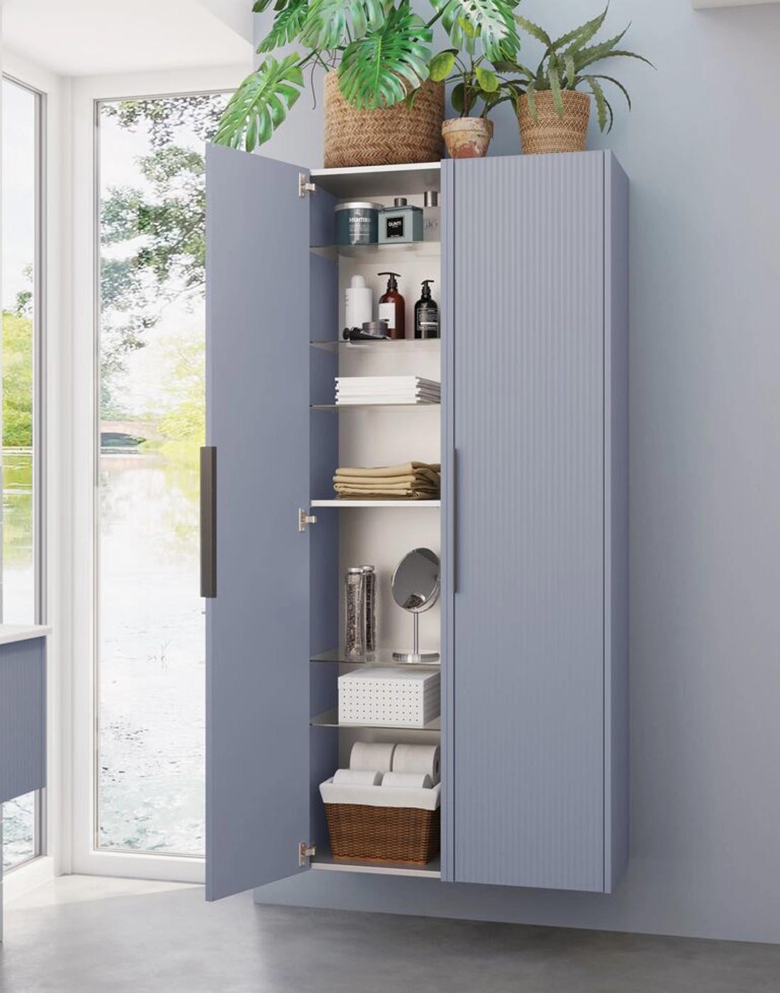 This tall cabinet combines the flexibility of a reversible door with an elegant fluted front that adds a modern touch to your bathroom. Inside you'll find a wooden shelf and 4 glass shelves, giving you plenty of space to organize your toiletries. The cabinet is available in white, sand or light blue, and the fitted handle makes the cabinet ready to use immediately.