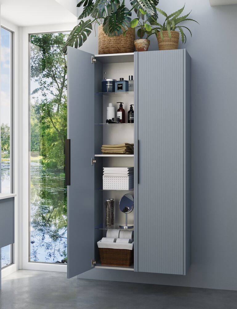 This tall cabinet combines the flexibility of a reversible door with an elegant fluted front that adds a modern touch to your bathroom. Inside you'll find a wooden shelf and 4 glass shelves, giving you plenty of space to organize your toiletries. The cabinet is available in white, sand or light blue, and the fitted handle makes the cabinet ready to use immediately.