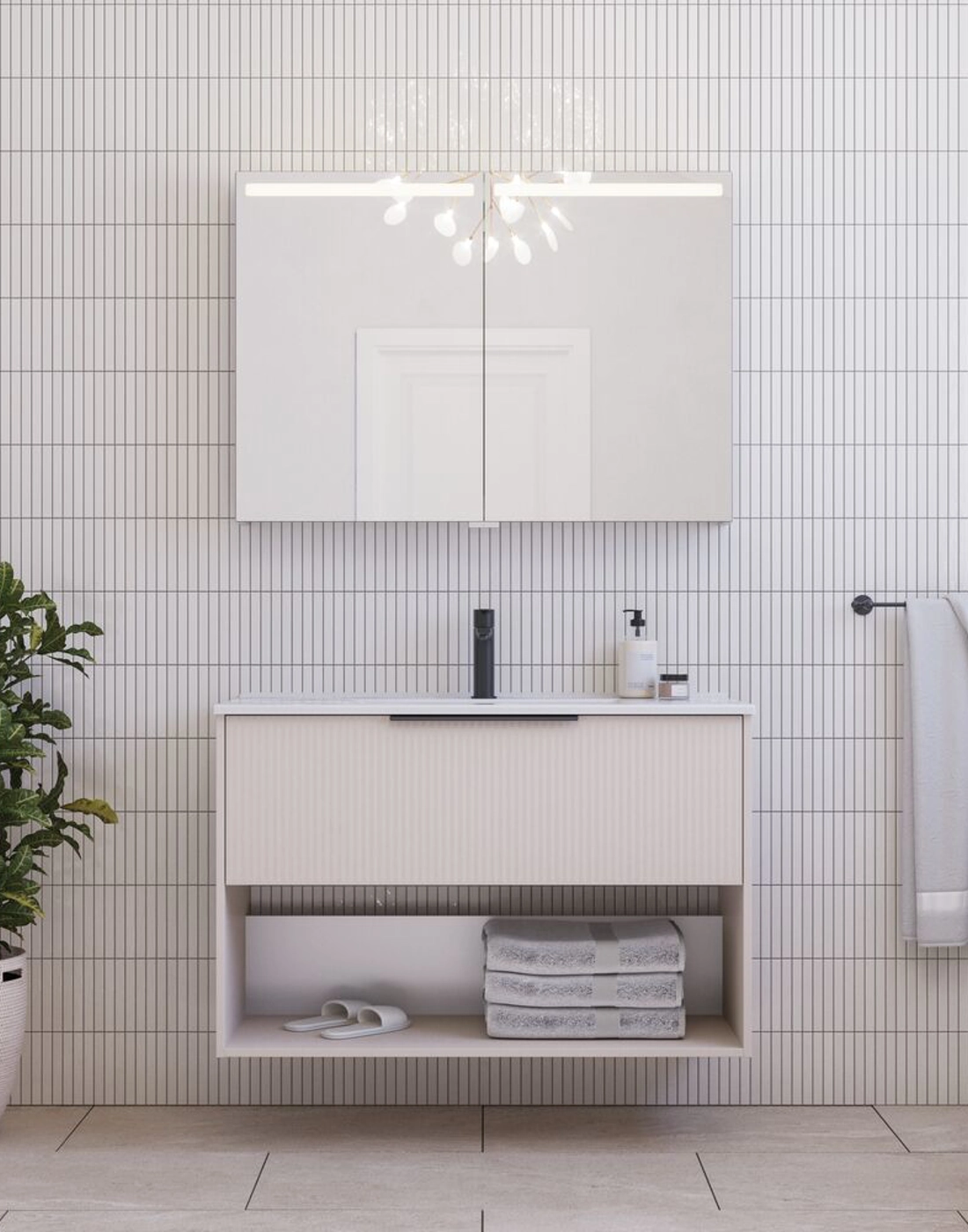 Take your morning to new heights with the Top mirror cabinet. This mirror cabinet has a lighting strip running the full cabinet width at the top of the cabinet, while inside you'll find plenty of storage space and an electrical socket with a switch. So you get much more than you might expect. Of course, the mirror cabinet is available with gables in beautiful colours, allowing you to create a uniform look in your bathroom.