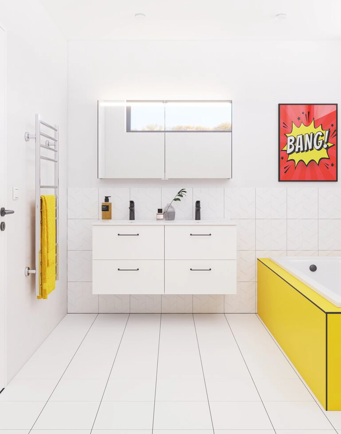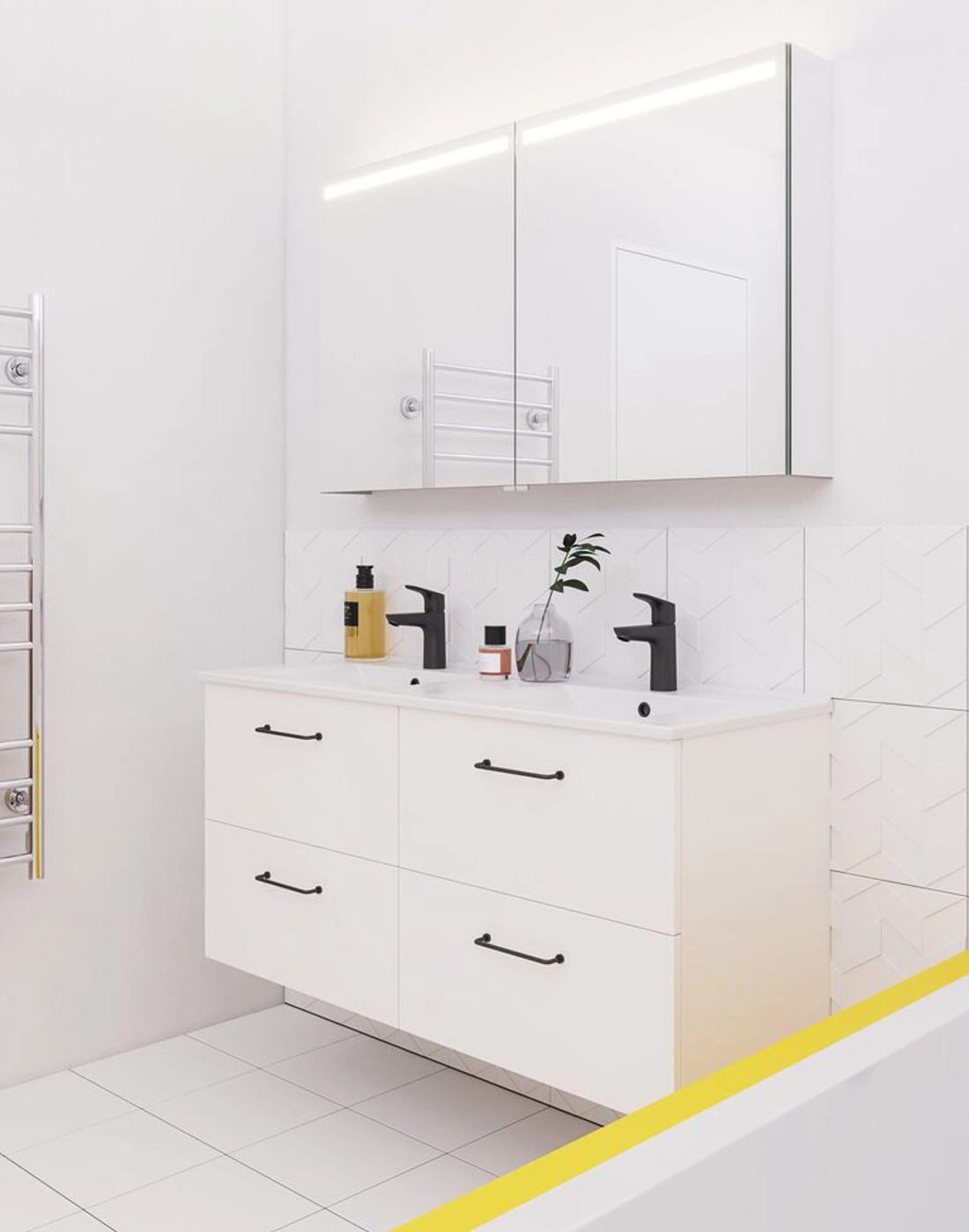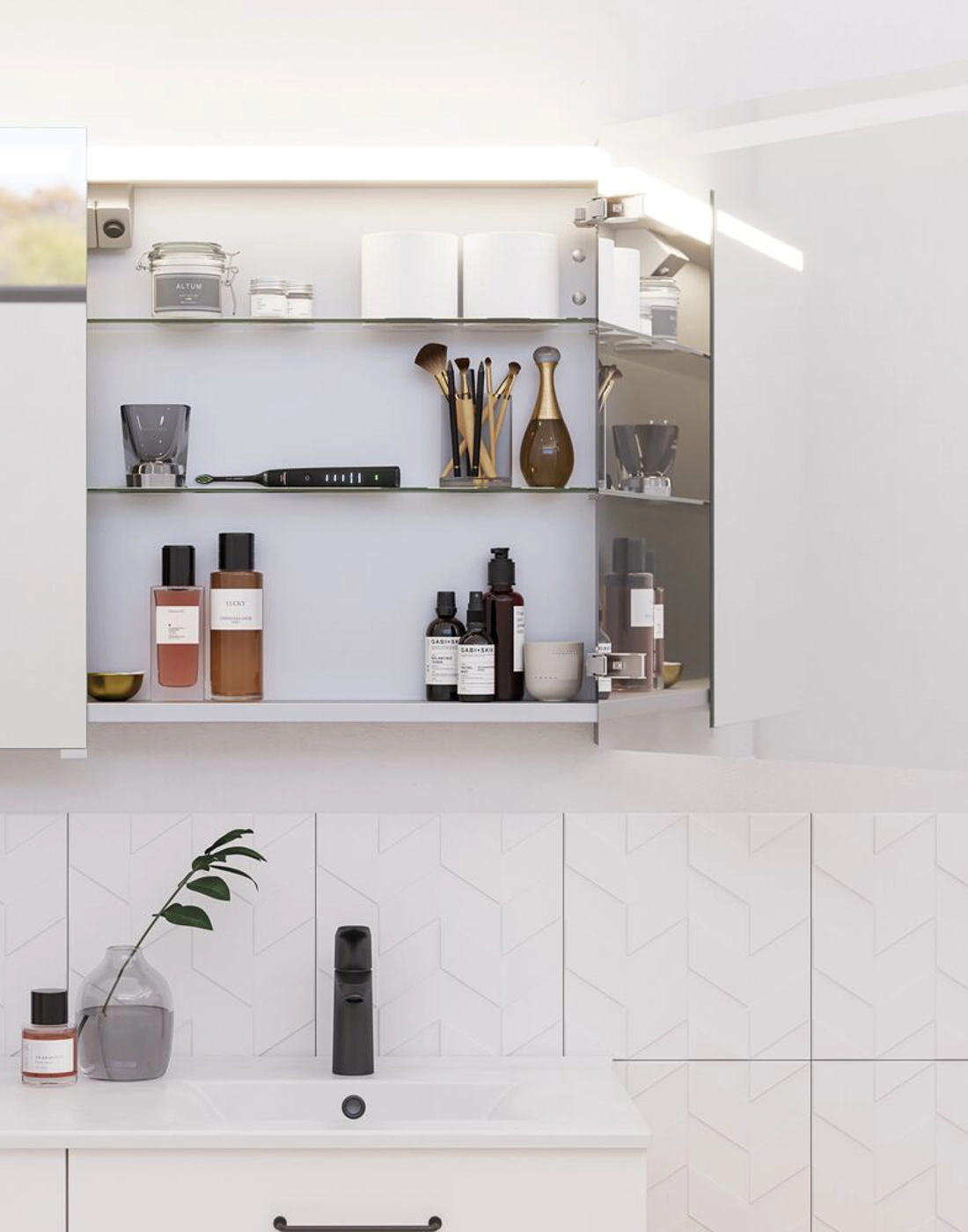 Take your morning to new heights with the Top mirror cabinet. This mirror cabinet has a lighting strip running the full cabinet width at the top of the cabinet, while inside you'll find plenty of storage space and an electrical socket with a switch. So you get much more than you might expect. Of course, the mirror cabinet is available with gables in beautiful colours, allowing you to create a uniform look in your bathroom.