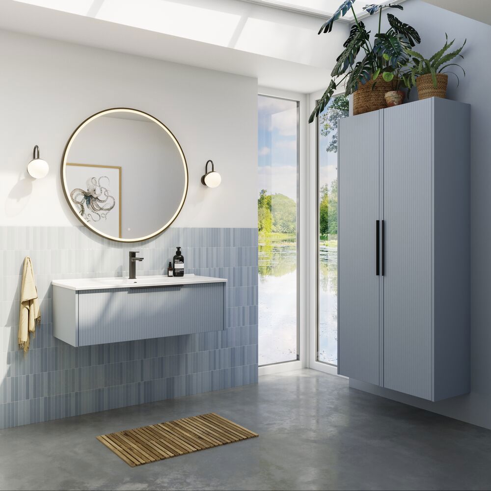 This vanity unit combines the simple functionality of 1 drawer with a stylish striped front to give your bathroom a unique and modern touch. Choose from white, sand or light blue to adapt the cabinet to your personal style. The spacious drawer gives you overview and storage space while the handle is mounted and ready to use.