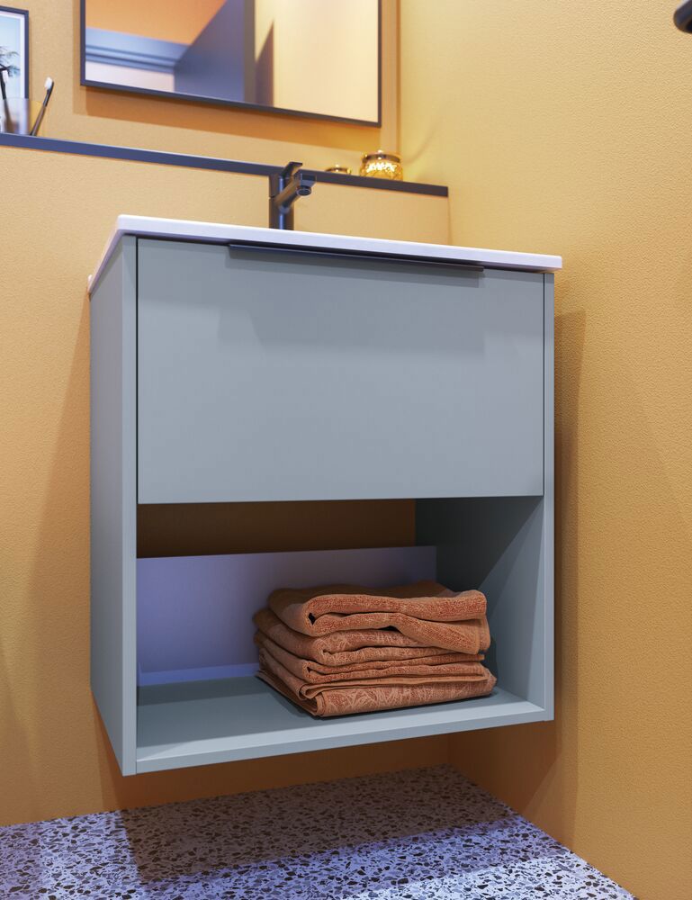 Here you get both storage space and the opportunity to display your favorite things. This vanity unit has a practical drawer and an open space that is perfect for displaying your nice towels or decorative items. Available in three elegant colors: white, sand and light blue. The drawer is spacious and the matching handle is attached so it's ready to use.