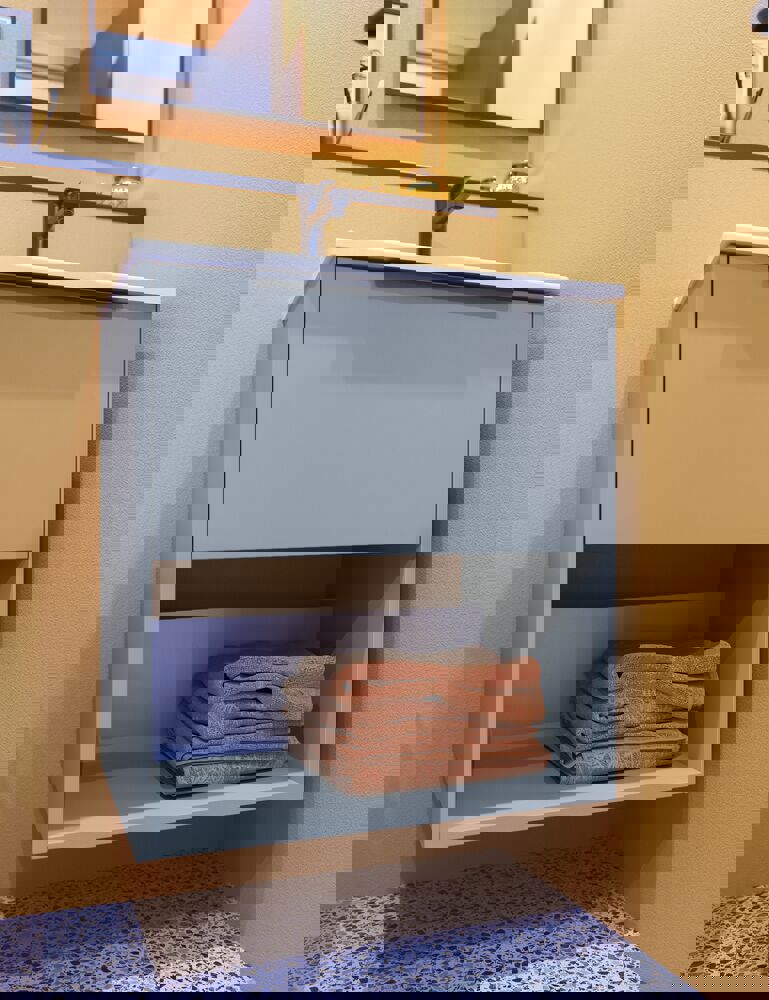 Here you get both storage space and the opportunity to display your favorite things. This vanity unit has a practical drawer and an open space that is perfect for displaying your nice towels or decorative items. Available in three elegant colors: white, sand and light blue. The drawer is spacious and the matching handle is attached so it's ready to use.