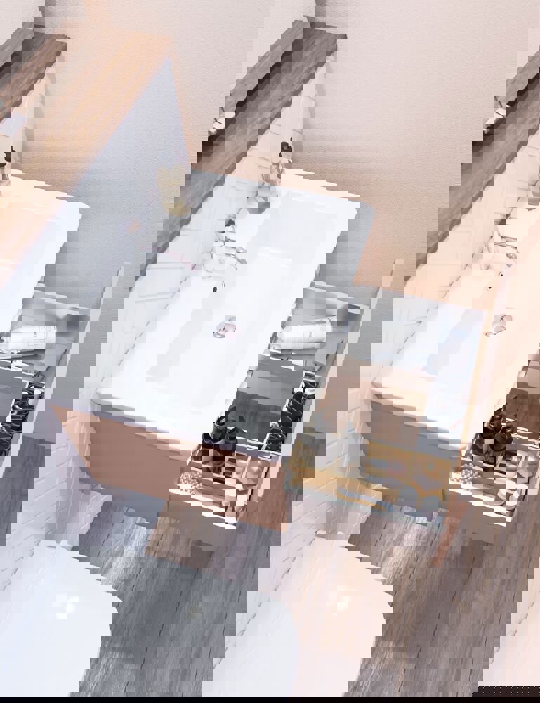 Transform your bathroom into a stylish oasis with the vanity unit featuring an integrated handle. This unit comes with a deep drawer that is 32 cm high, offering optimal storage space for your essential bathroom items. The handle is standardly black, providing a modern contrast to your bathroom. However, if you choose to have your vanity unit in a custom color, the handle will be tinted in the same shade, creating a harmonious connection. The minimalist design with the integrated handle gives a clean and modern look that perfectly suits any contemporary bathroom. It is not only functional but also an aesthetic addition that makes it easy to keep your space organized. NB: There is a start-up fee (BI2) for products with bespoke colour. It is an one-off surcharge per bespoke colour regardless number of products. Remember to add the little practical things to your bathroom furniture that you will enjoy on a daily basis. For example, lights in drawers and cabinets, built-in electrical sockets and dimmed sensor lights under the furniture to guide night-time bathroom visits. Options are ordered at the same time as your furniture.