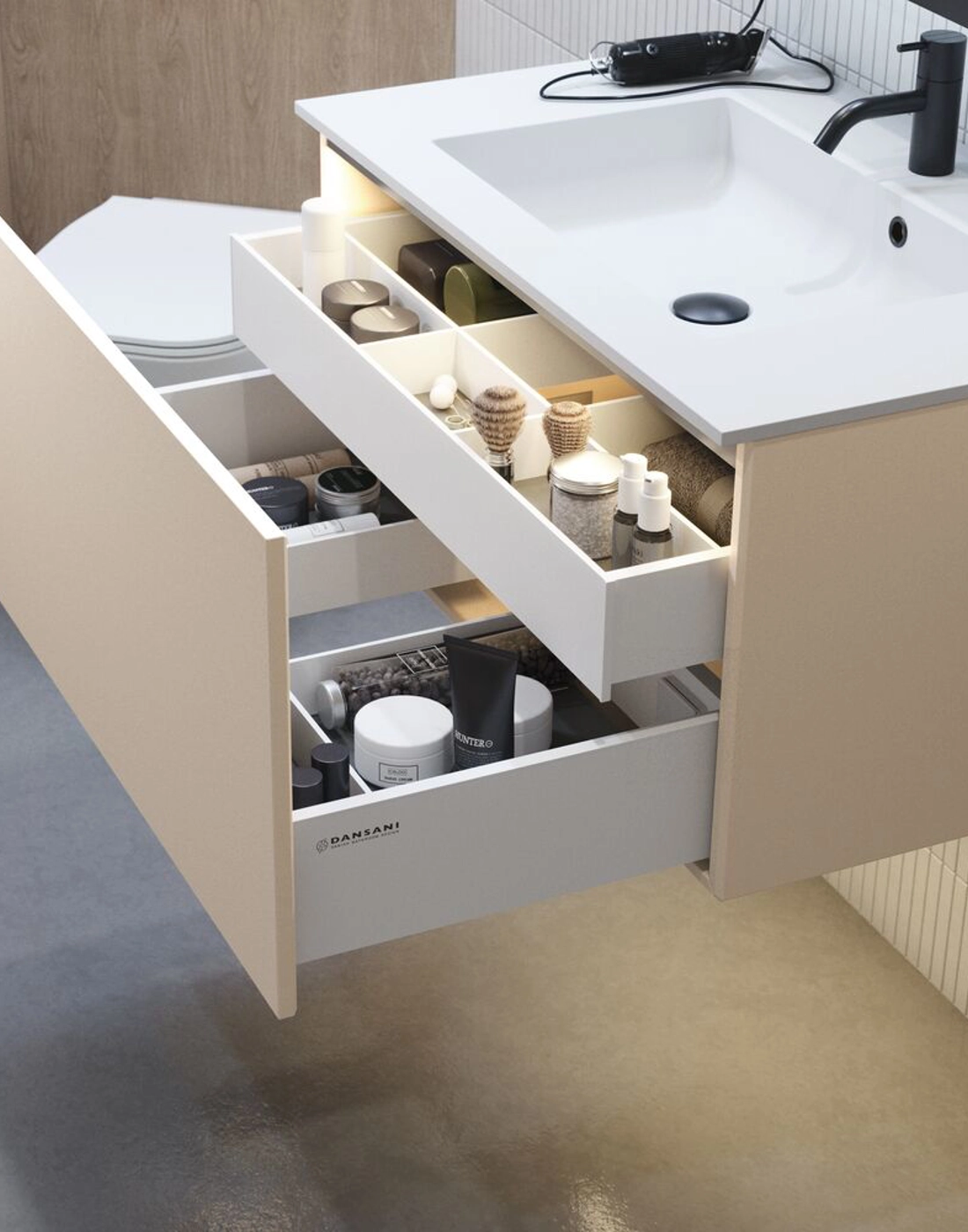 The Dansani Calidris 1-drawer vanity unit combines elegance and functionality in your bathroom. The minimalist design and simple lines of the Calidris vanity unit add a sophisticated look to your bathroom. The drawer provides ample space to store all the essentials in your bathroom. With a focus on both functionality and design, the Dansani Calidris 1-drawer vanity unit is the ideal choice for those who want a stylish and well-organised bathroom. NB: There is a start-up fee (BI2) for products with oak and bespoke colour. It is an one-off surcharge per oak and bespoke colour regardless number of products. Remember to add the little practical things to your bathroom furniture that you will enjoy on a daily basis. For example, lights in drawers and cabinets, built-in electrical sockets and dimmed sensor lights under the furniture to guide night-time bathroom visits. Options are ordered at the same time as your furniture.