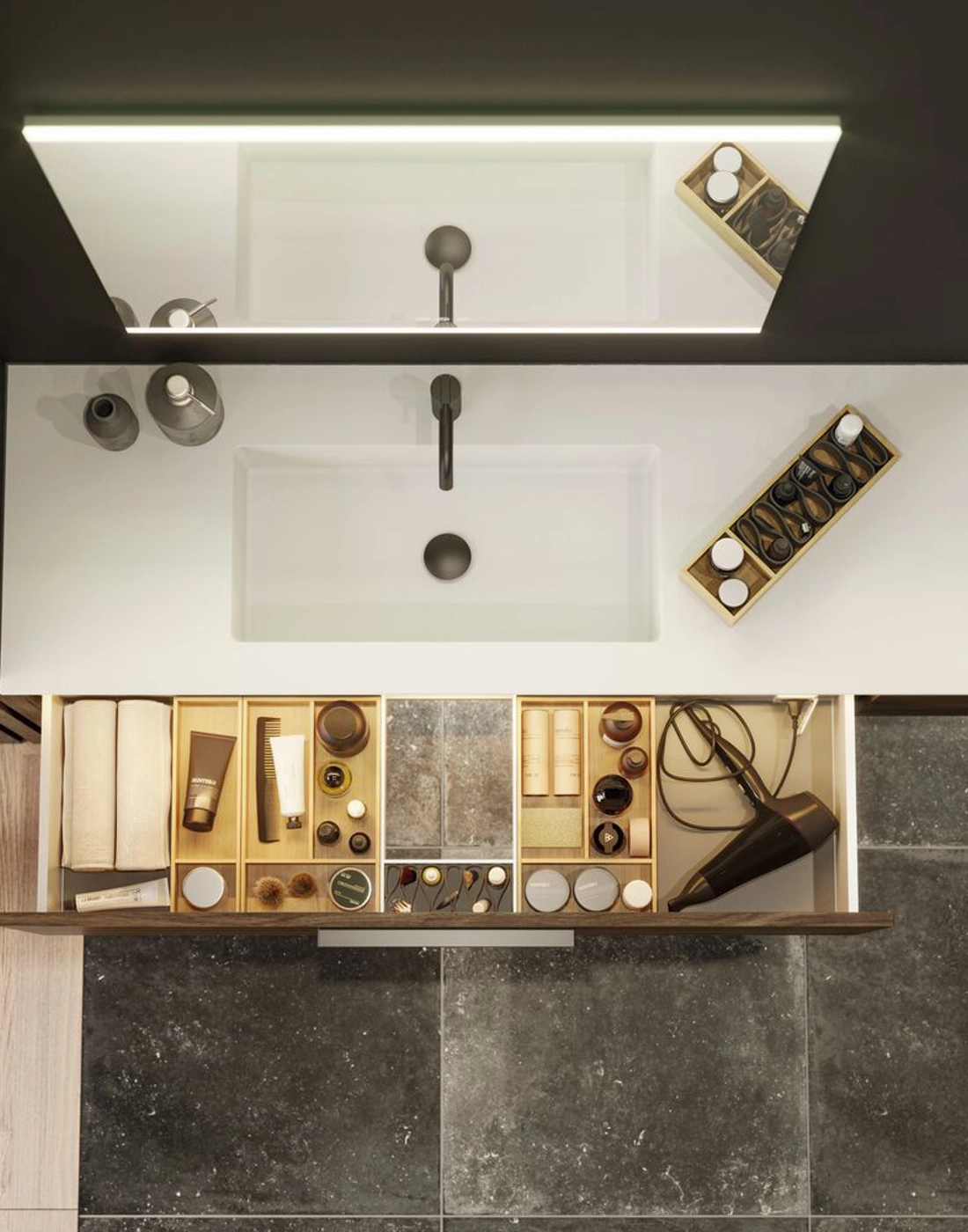 Upgrade your bathroom with style and functionality with a vanity unit. The smart, single-drawer design gives you the perfect storage solution for your bathroom products. Keep your bathroom tidy and organized with this elegant unit that fits in with any decor. The vanity unit is available in several different colors, so you can choose the one that best suits your style. NB: There is a start-up fee (BI2) for products with bespoke colour. It is an one-off surcharge per bespoke colour regardless number of products. Remember to add the little practical things to your bathroom furniture that you will enjoy on a daily basis. For example, lights in drawers and cabinets, built-in electrical sockets and dimmed sensor lights under the furniture to guide night-time bathroom visits. Options are ordered at the same time as your furniture.