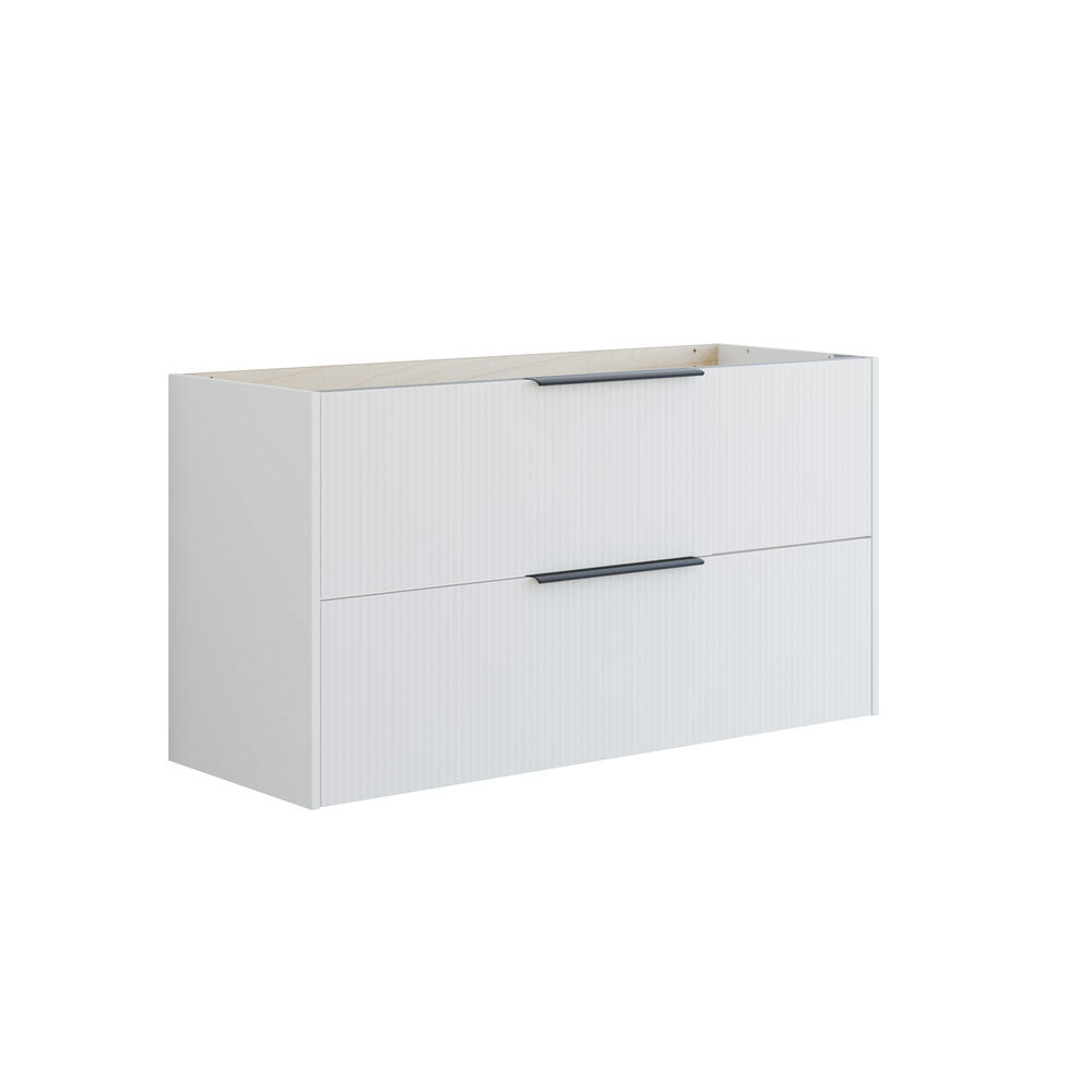 This vanity unit combines functionality and style with its 2 spacious drawers and an elegant striped front. Available in white, sand or light blue, this cabinet will give your bathroom a modern and unique look. The drawers offer plenty of storage space and the handles are fitted and ready to use.