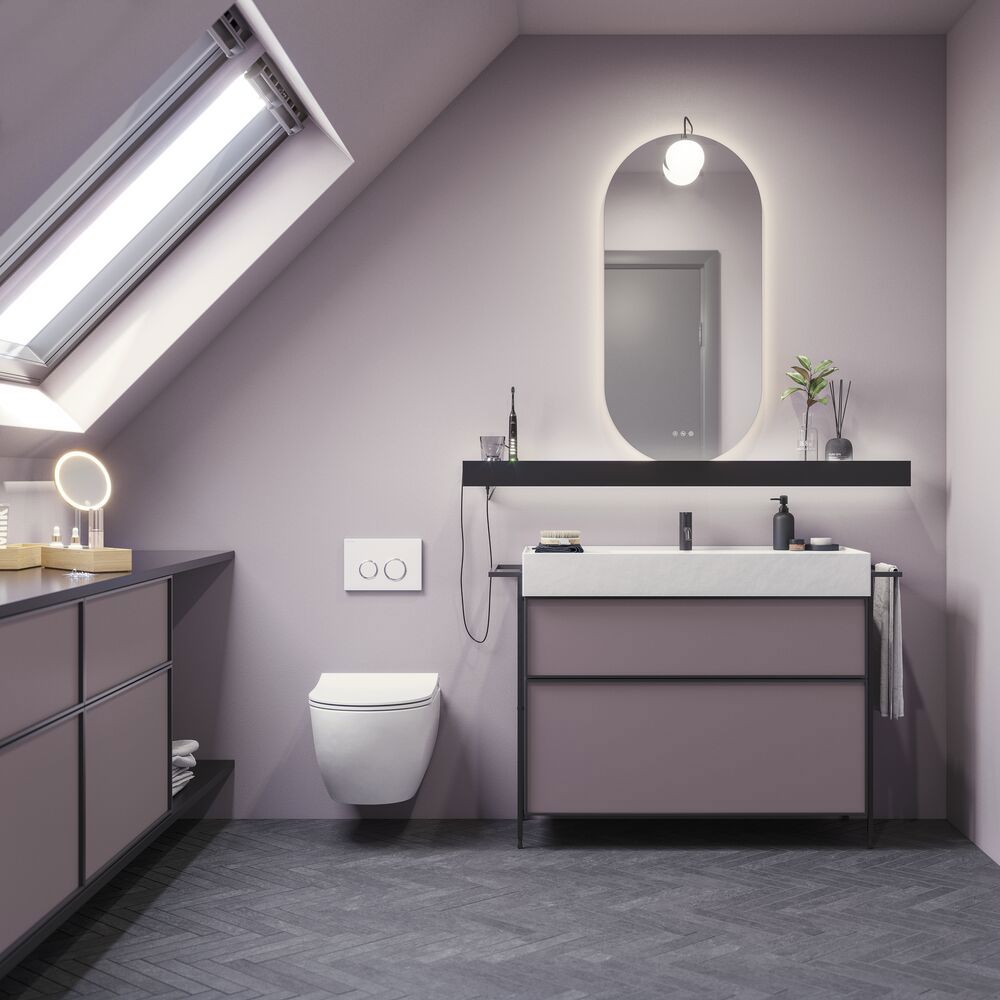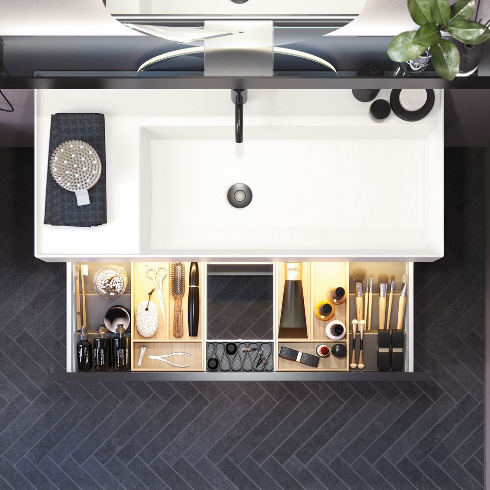 Upgrade your bathroom with the vanity unit featuring 2 drawers. This stylish unit is 64 cm tall and 44 cm deep, making it ideal for organizing your bathroom products. The elegant black frame around the drawers adds a modern and sophisticated touch that fits any decor. Choose from various colors to find the best match for your style. This vanity unit makes it easy to organize your bathroom essentials and keep everything tidy. The 2-drawer vanity unit combines practical functionality with beautiful design, making it a perfect addition to your bathroom. Make your space more organized and stylish with this fantastic unit. NB: There is a start-up fee (BI2) for products with bespoke colour. It is an one-off surcharge per bespoke colour regardless number of products. Remember to add the little practical things to your bathroom furniture that you will enjoy on a daily basis. For example, lights in drawers and cabinets, built-in electrical sockets and dimmed sensor lights under the furniture to guide night-time bathroom visits. Options are ordered at the same time as your furniture.