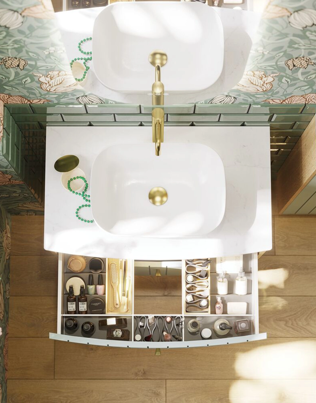 The 2-drawer vanity units offer a charming retro design for your bathroom. The curved fronts have beautiful grooves providing plenty of character. The units are available in many different finishes, so you can choose the colour that best suits your personal style. In addition to their beautiful appearance, the units are also practical with two spacious drawers for storing your essentials. Add timeless elegance to your bathroom with the vanity units and enjoy the unique touch they bring to the space. NB: There is a start-up fee (BI2) for products with bespoke colour. It is an one-off surcharge per bespoke colour regardless number of products. Remember to add the little practical things to your bathroom furniture that you will enjoy on a daily basis. For example, lights in drawers and cabinets, built-in electrical sockets and dimmed sensor lights under the furniture to guide night-time bathroom visits. Options are ordered at the same time as your furniture.