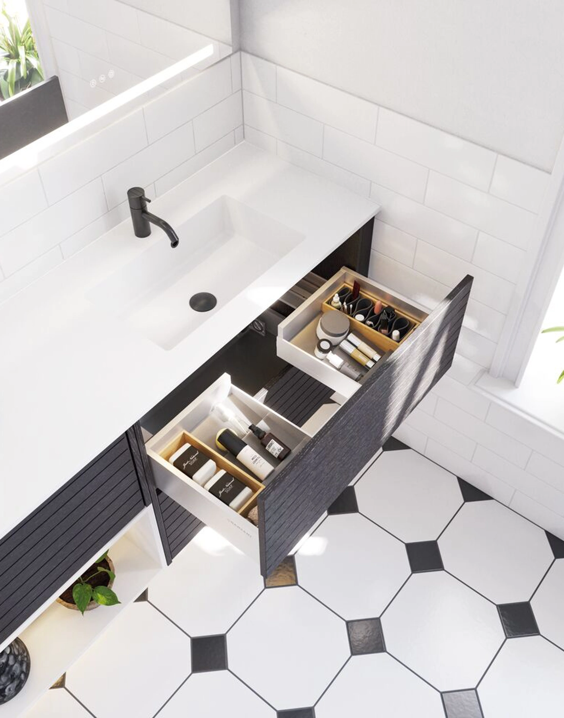 Create a unique style in your bathroom with the vanity unit with a grooved front. The two drawers, each 32 cm high, provide optimal storage to keep your bathroom items neatly organized. The grooved front adds a distinctive, modern look that stands out and brings personality to your space. This unit combines functionality with aesthetics, making it the ideal choice for those who want their bathroom to be both practical and stylish. Remember to add the little practical things to your bathroom furniture that you will enjoy on a daily basis. For example, lights in drawers and cabinets, built-in electrical sockets and dimmed sensor lights under the furniture to guide night-time bathroom visits. Options are ordered at the same time as your furniture.