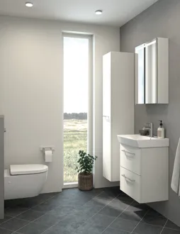 Upgrade your bathroom with a budget-friendly choice - the Dansani Mido+ 2-drawer vanity unit. With a depth of 35cm, this vanity unit is perfect for smaller bathrooms, guest toilets or holiday homes. In addition, this vanity unit has a cut-out with plenty of room for all fittings & pipework. The Dansani Mido+ vanity unit is affordably priced, and you can also add options such as drawer lights and wooden trays for a better overview of contents and organisation in the bathroom. All Mido+ cabinets come with the classic Base handle in chrome. You can choose a different handle for a different look, but remember that it must be ordered together with your furniture. Remember to add the little practical things to your bathroom furniture that you will enjoy on a daily basis. For example, lights and drawer dividers in drawers.