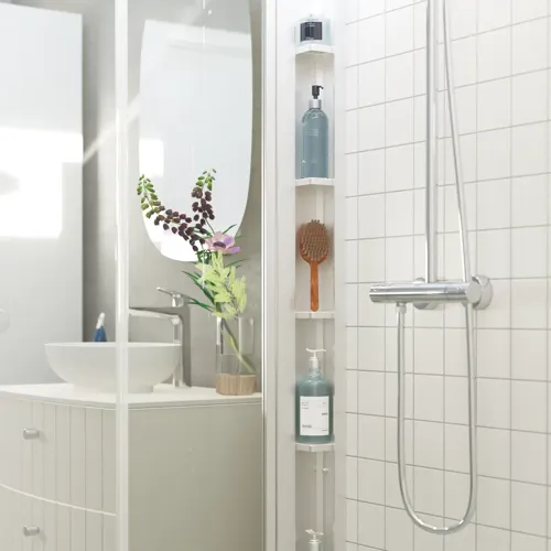 Simple & elegant shower caddy with 5 movable shelves. Easily combined with Match doors, to keep track of soap, shampoo and everything you need in the shower. Simply choose a model 10cm smaller to allow space for Tower.