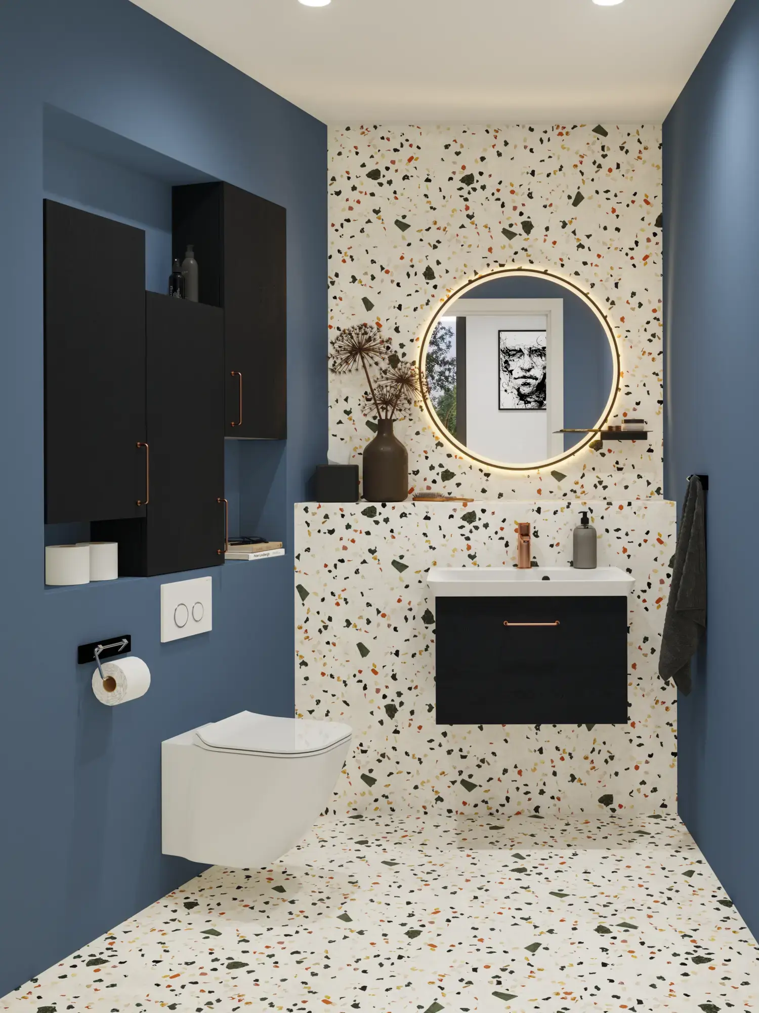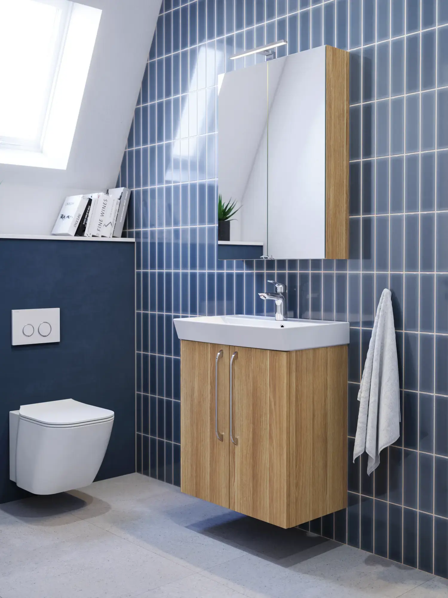 This warm oak furniture set brings natural elegance into the room, beautifully contrasted by the deep blue tiles. The slim, wall-mounted vanity enhances the sense of space while offering practical storage behind soft-closing doors. Paired with the stylish Cappella basin and the sleek Select mirror cabinet, the design combines everyday functionality with a clean, Scandinavian look.