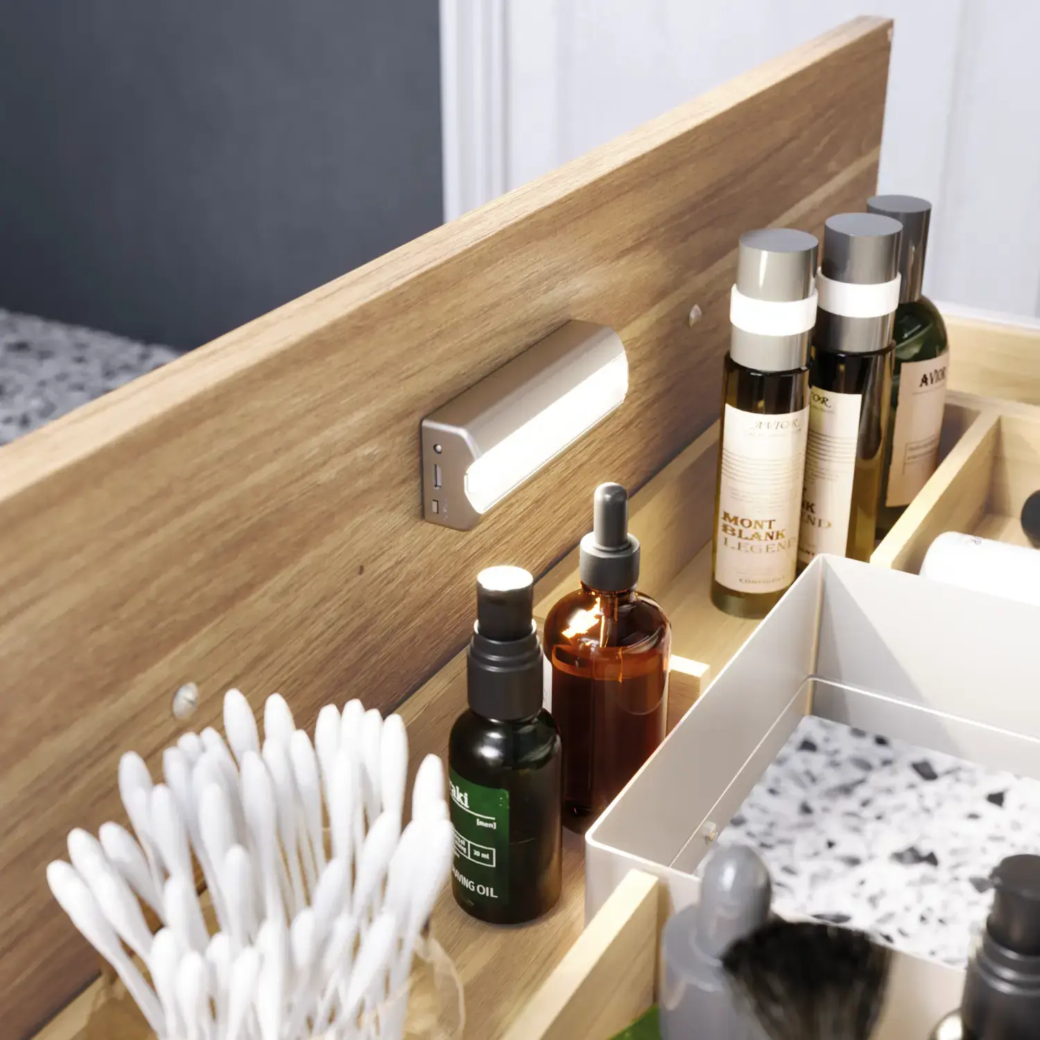 Drawer lighting enhances both ambience and practicality. Easily rechargeable with the included USB cable.
