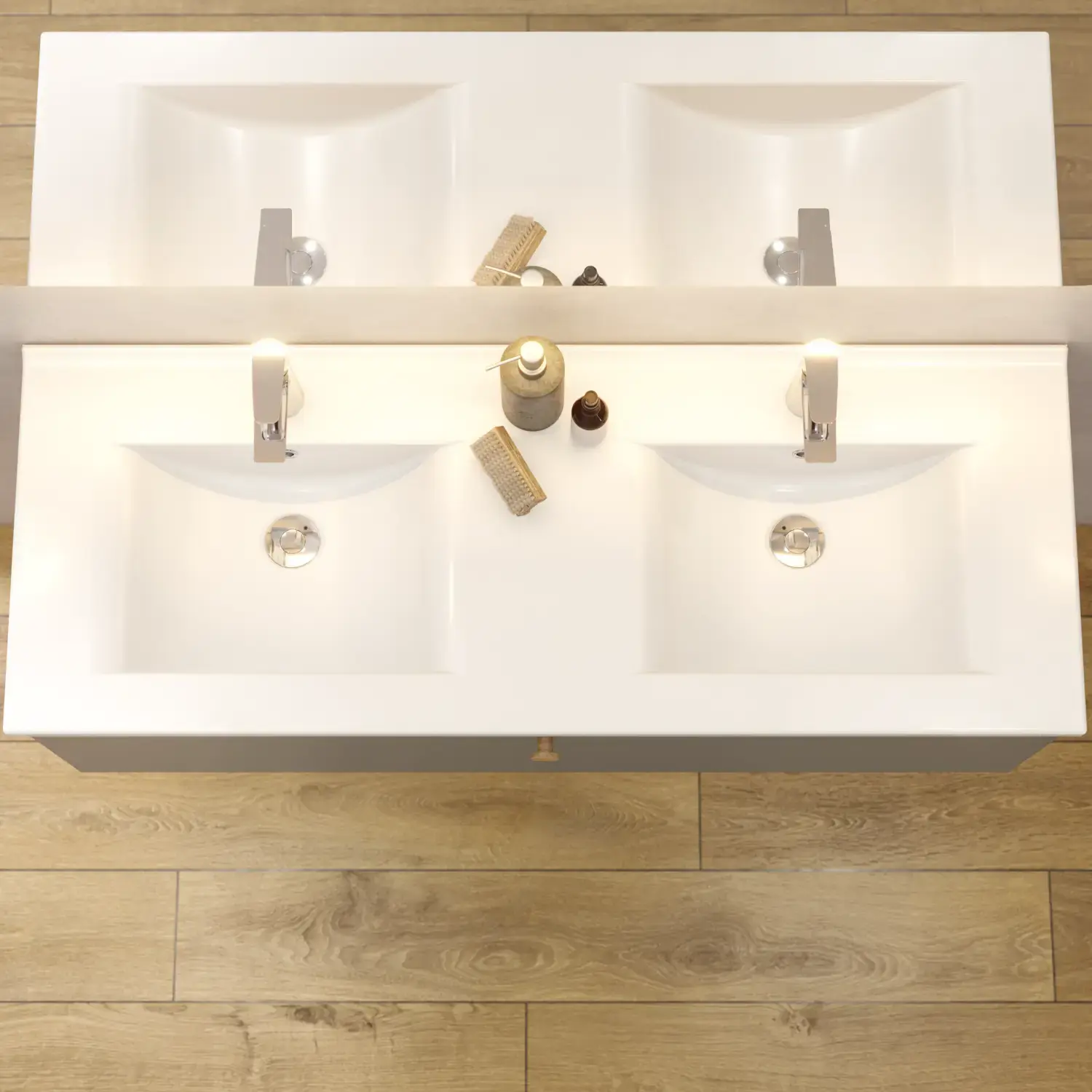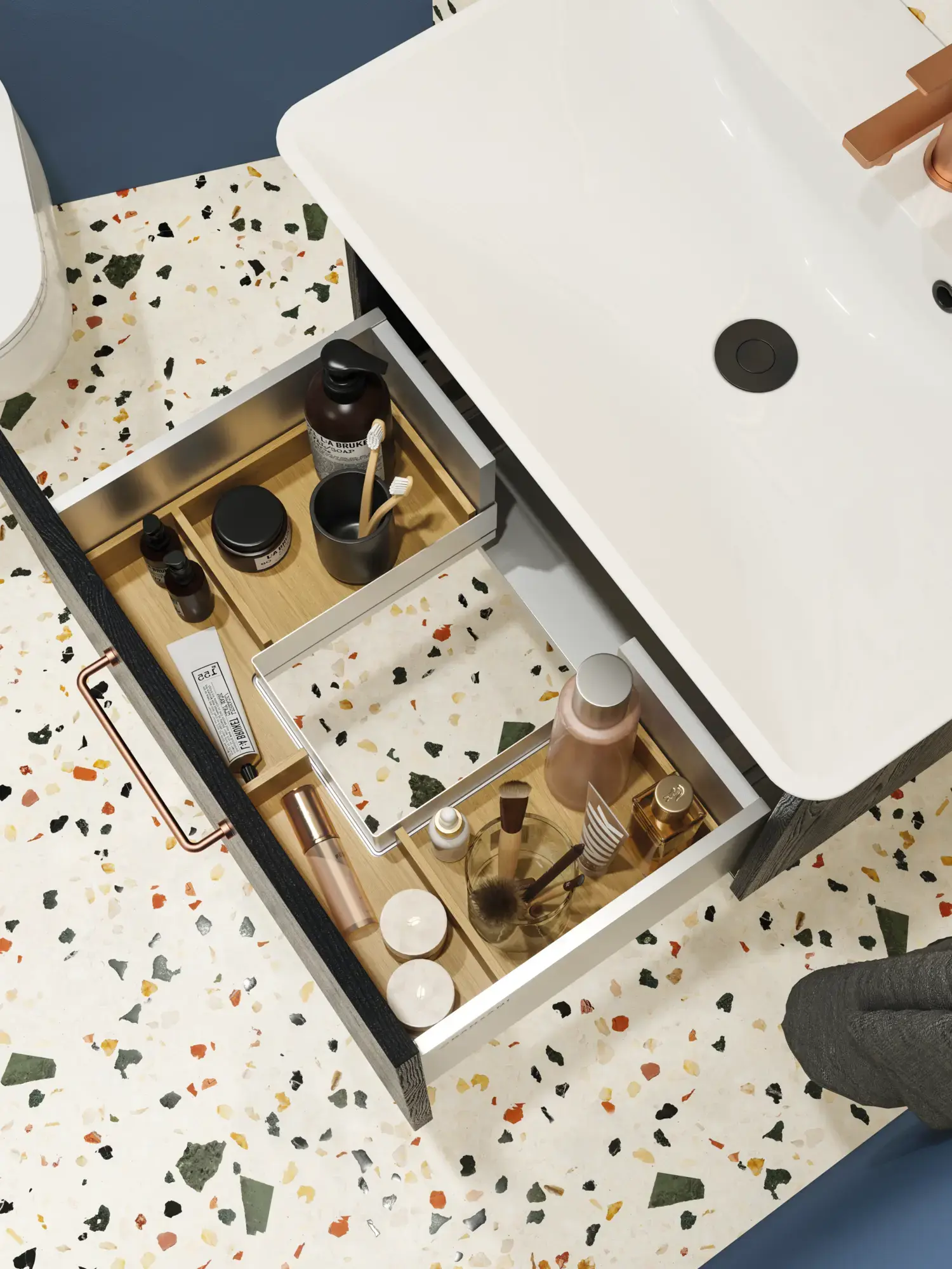 The vanity unit drawers provide generous storage space to keep everything neatly organised. They are fully extendable and softclosing. The top drawer includes a cut-out for easy installation of water and waste fittings.